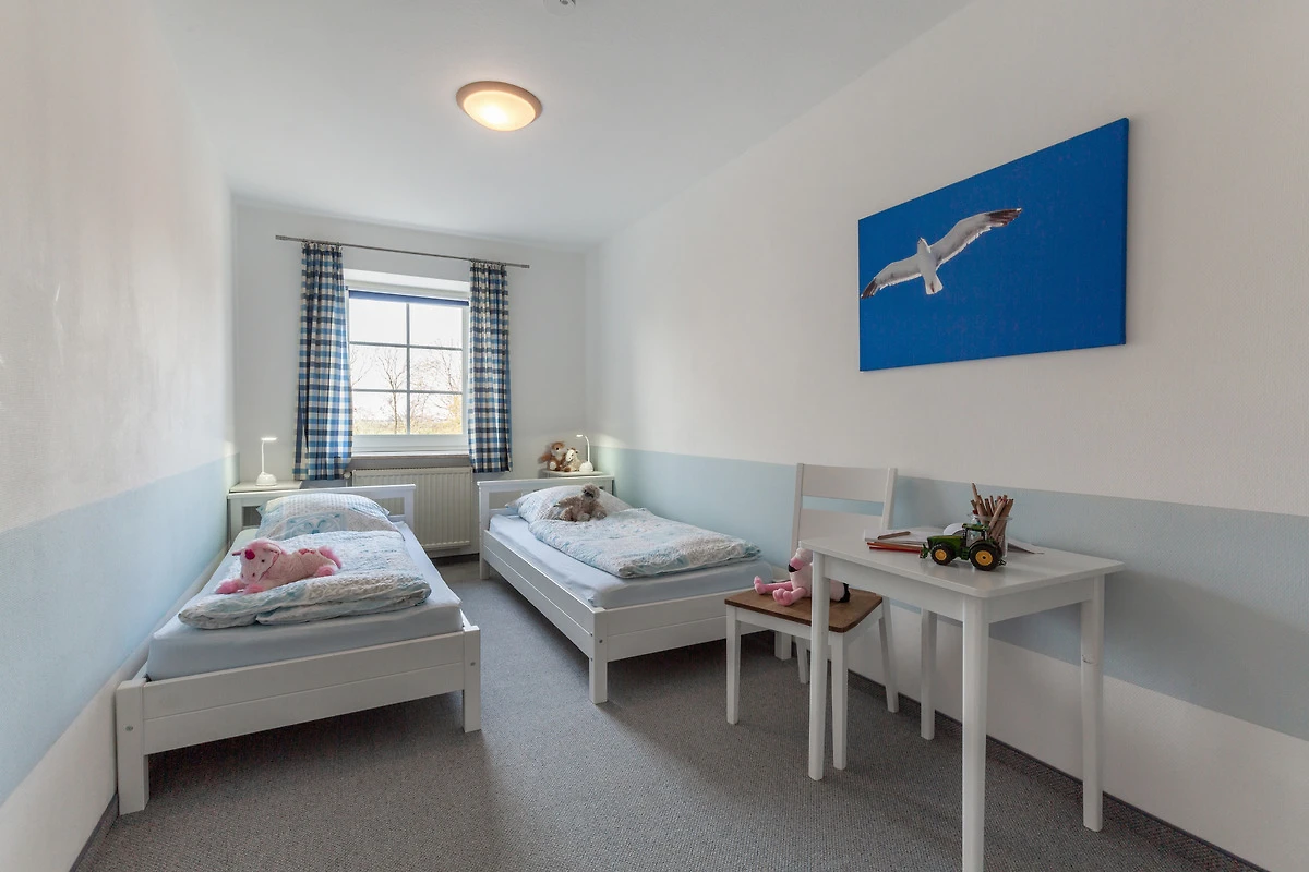 Die Wohnung Schwalbennest liegt im 1. Obergeschoss im hinteren Teil unserer ausgebauten Scheune auf dem Ferienhof Marquardt. Die Wohnung verfügt über ein Elternschlafzimmer mit Doppelbett, ein Kinderschlafzimmer mit zwei Einzelbetten. Weiterhin gibt es ein Duschbad, eine Küche und einen Wohnzimmer mit Essbereich und einem Balkon zum Garten. Im Garten stehen Ihnen weitere Sitzmöglichkeiten zur Verfügung.