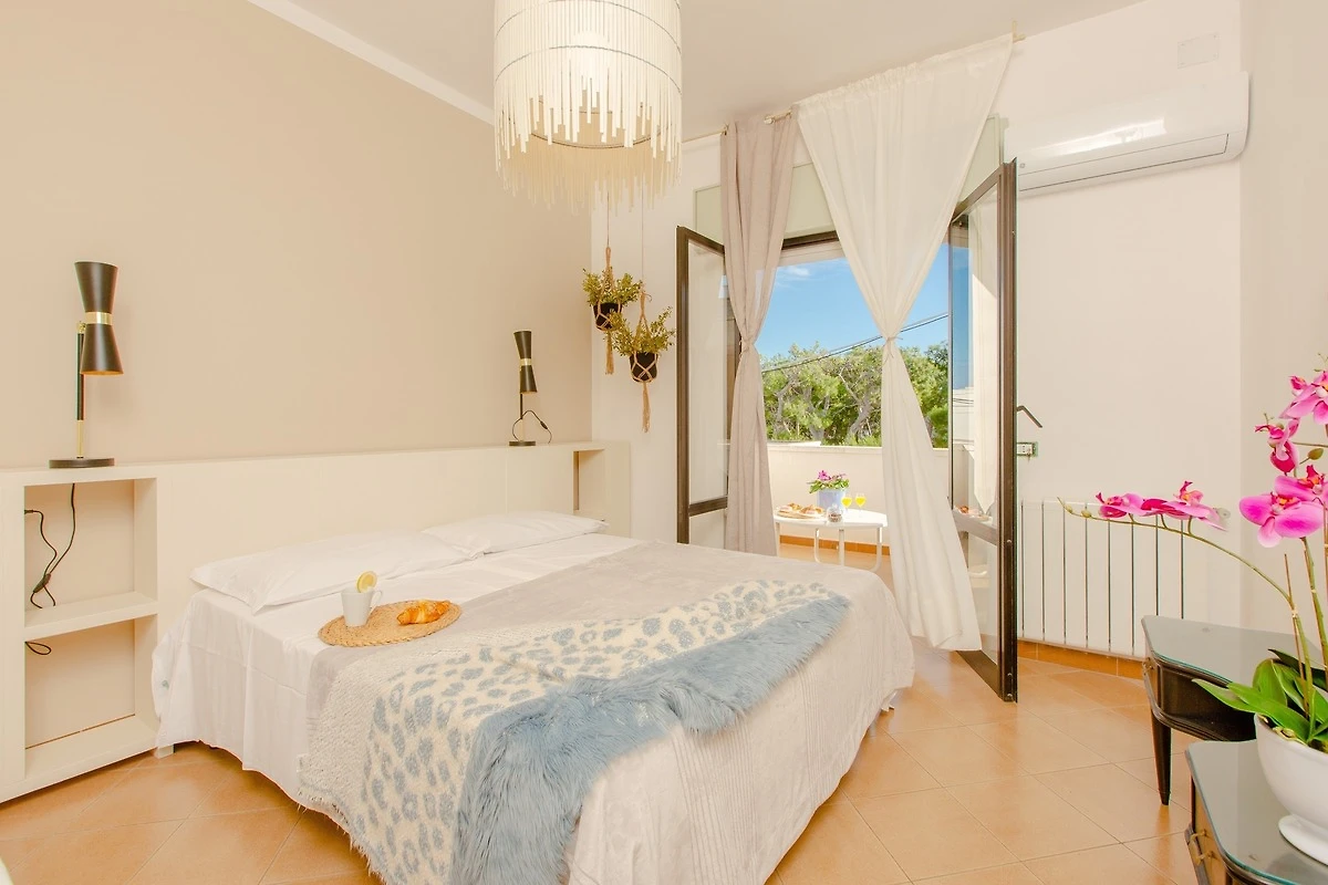 Haus in der Via delle Orchidee in Torre Santa Sabina. Im Erdgeschoss befindet sich ein Wohnzimmer mit Doppelschlafcouch, 50-Zoll-Fernseher und Deckenventilator, eine ausgestattete Küche, ein Badezimmer mit Dusche, ein Innenhof mit Waschbecken. Im ersten Stock befinden sich zwei klimatisierte Schlafzimmer mit je drei Betten, ein drittes Schlafzimmer mit Doppelbett, ein Badezimmer mit Dusche und Zugang zur Terrasse mit Meerblick. Ein Schlafzimmer bietet eine Terrasse mit Gartenmöbeln. Schlaf n.8.