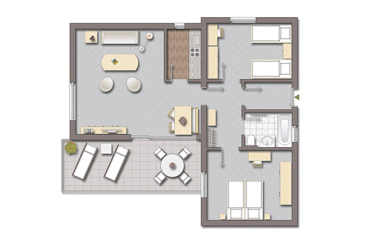 Es sind geräumige und komfortable Ferienhäuser, die auf einer Fläche von 75 m² auch bei voller Belegung ausreichend Platz bieten. Das Ferienhaus "Kastanie" verfügt über zwei Schlafzimmer mit insgesamt vier Betten, einen Wohnraum mit Schlafcouch und Essbereich. Die Küche ist separat zugänglich und mit Mikrowelle, Kaffee- und Spülmaschine sowie diversen Kochutensilien gut ausgestattet, um sich auch unabhängig von der Hotelgastronomie selbst versorgen zu können.