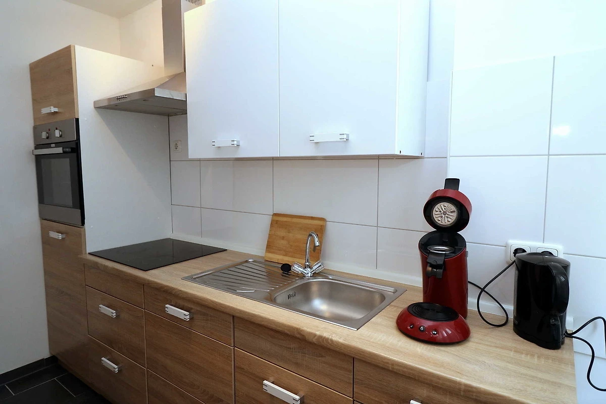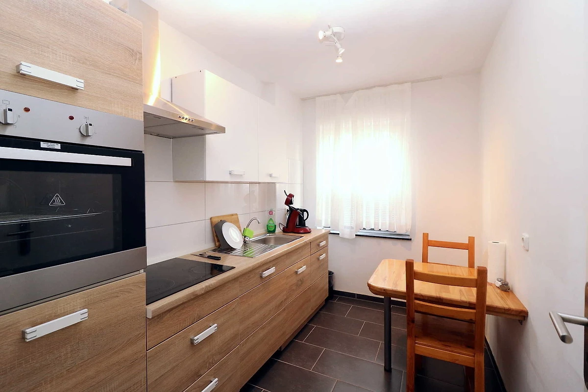 Küche mit Kühlschrank (3-Sterne-Gefrierfach), Backofen, Ceranfeld, Dunstabzughaube mit Kochfeldbeleuchtung, Spülmaschine, Spüle, Kaffeemaschine, Wasserkocher, Tisch und 2 Stühlen