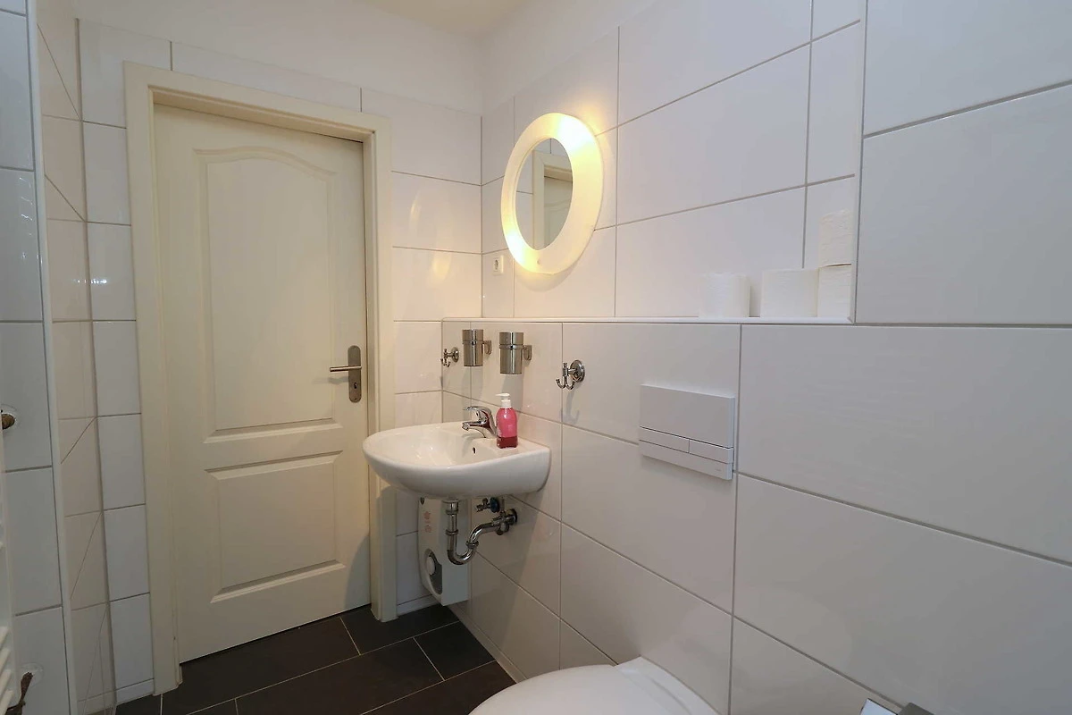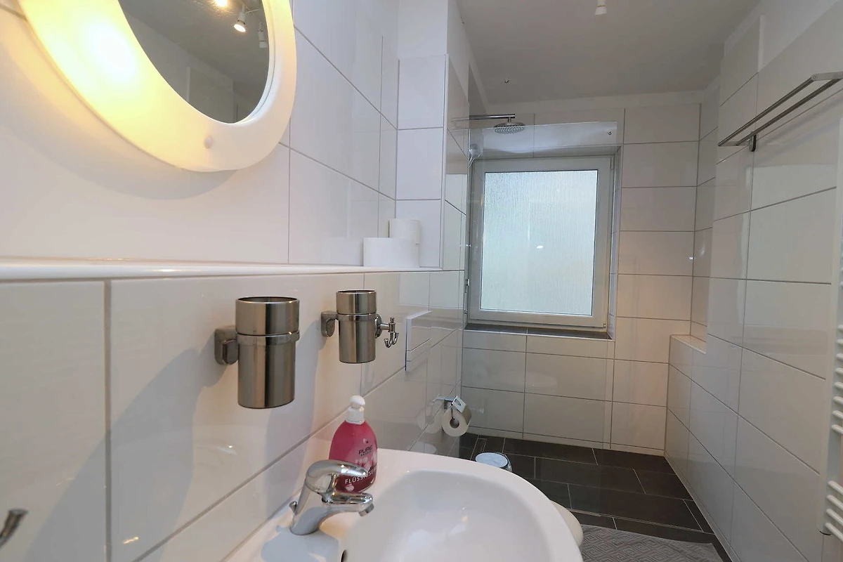 Duschbad mit ebenerdiger Dusche, Waschtisch, Spiegelschrank und WC, Ein Föhn steht ebenfalls zur Verfügung.