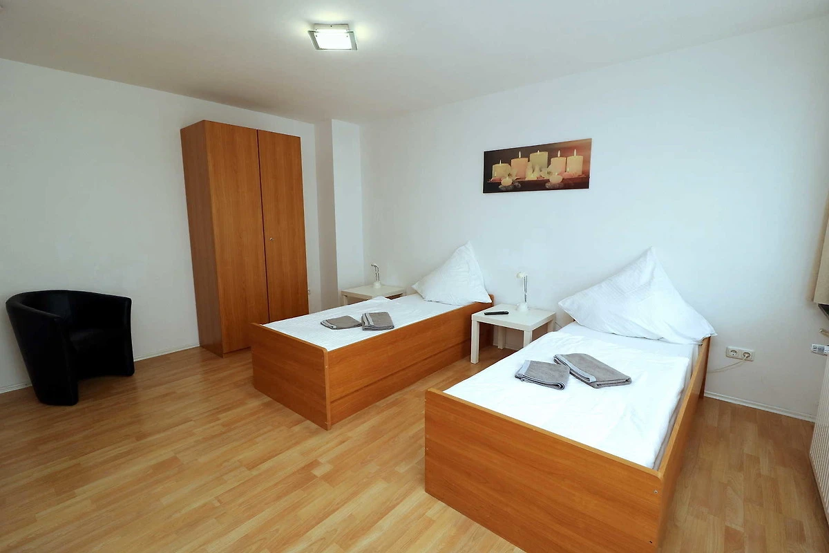Schlafzimmer 1 (202) mit 2 Einzelbetten, einem Kleiderschrank, modernen Schrankelementen, Kabel-TV, kleinem Schreibtisch und Clubsessel. Schlafzimmer 2 (203) mit 2 Einzelbetten, einem Kleiderschrank, modernen Schrankelementen, Kabel-TV, kleinem Schreibtisch und Clubsessel, Zugang zum Balkon.