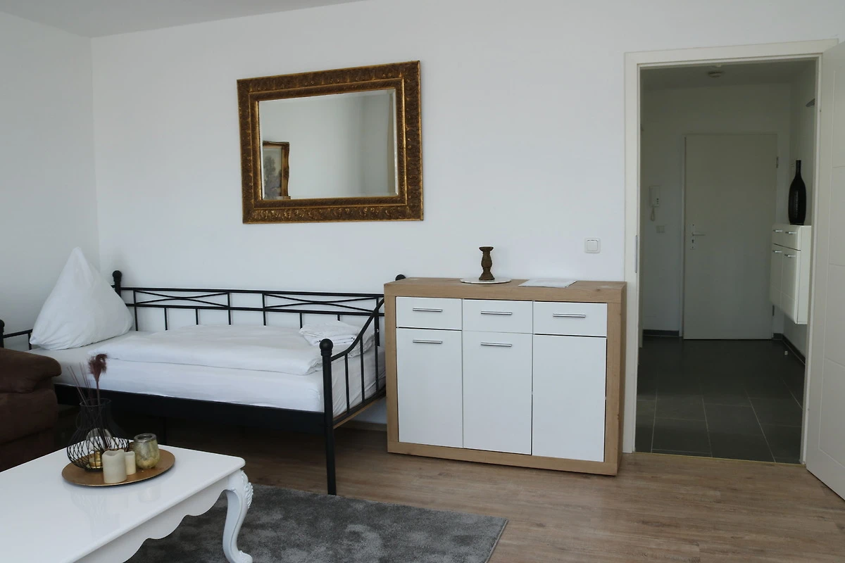 Im grosszügigen Wohnzimmer befinden sich ein Sofa mit Schlaffunktion und ein Einzelbett, Couchtisch und moderne Schrankelemente mit Kabel-TV.