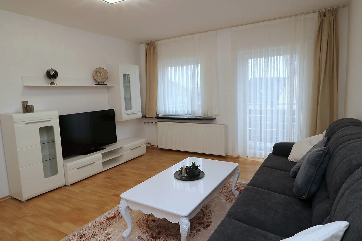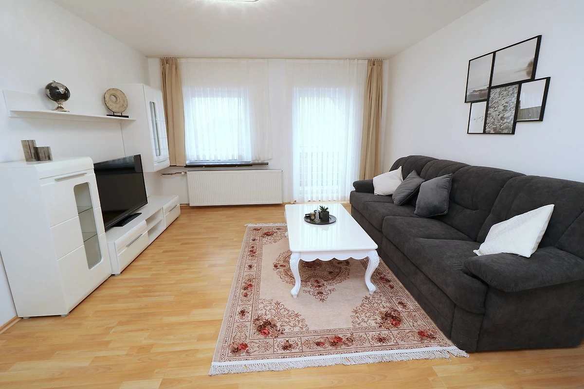 Das Wohnzimmer besitzt ein grosses Sofa mit Schlaffunktion, Couchtisch, moderne Schrankelemente und Kabel-TV.