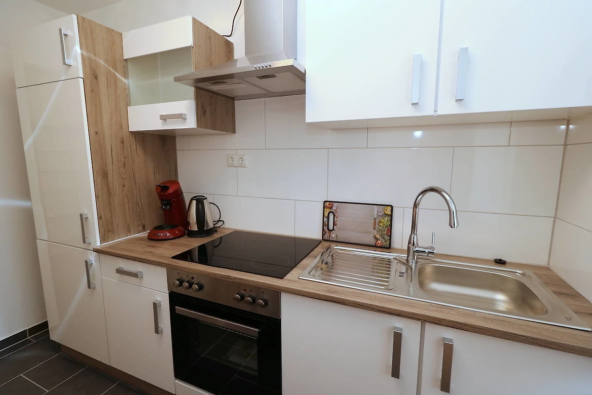 Die Küche verfügt über keine Spülmaschine. Kühlschrank mit 3-Sterne-Gefrierfach, Backofen, Ceranfeld, Dunstabzug mit Kochfeldberleuchtung, Spüle, Kaffeemaschine und Wasserkocher sowie Topfset/Pfanne, Geschirr, Besteck, Tassen und Gläser sind für 4 Personen sind vorhanden. Bei Buchung für 5 Personen stellen wir Ihnen weiteres Geschirr zur Verfügung.