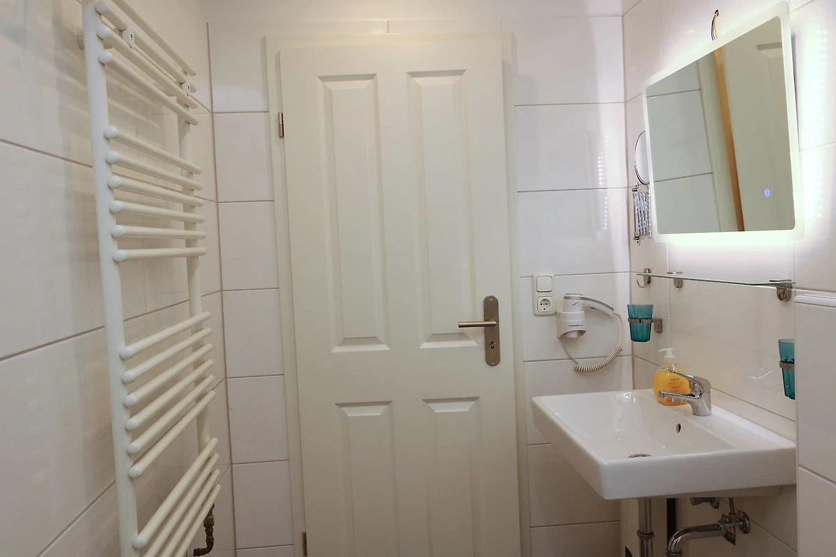 Das Badezimmer besitzt eine ebenerdige Dusche, einen Waschtisch, Glasablage, einen beleuchteten Spiegel und das WC. Schminkspiegel und Föhn sind ebenfalls vorhanden.