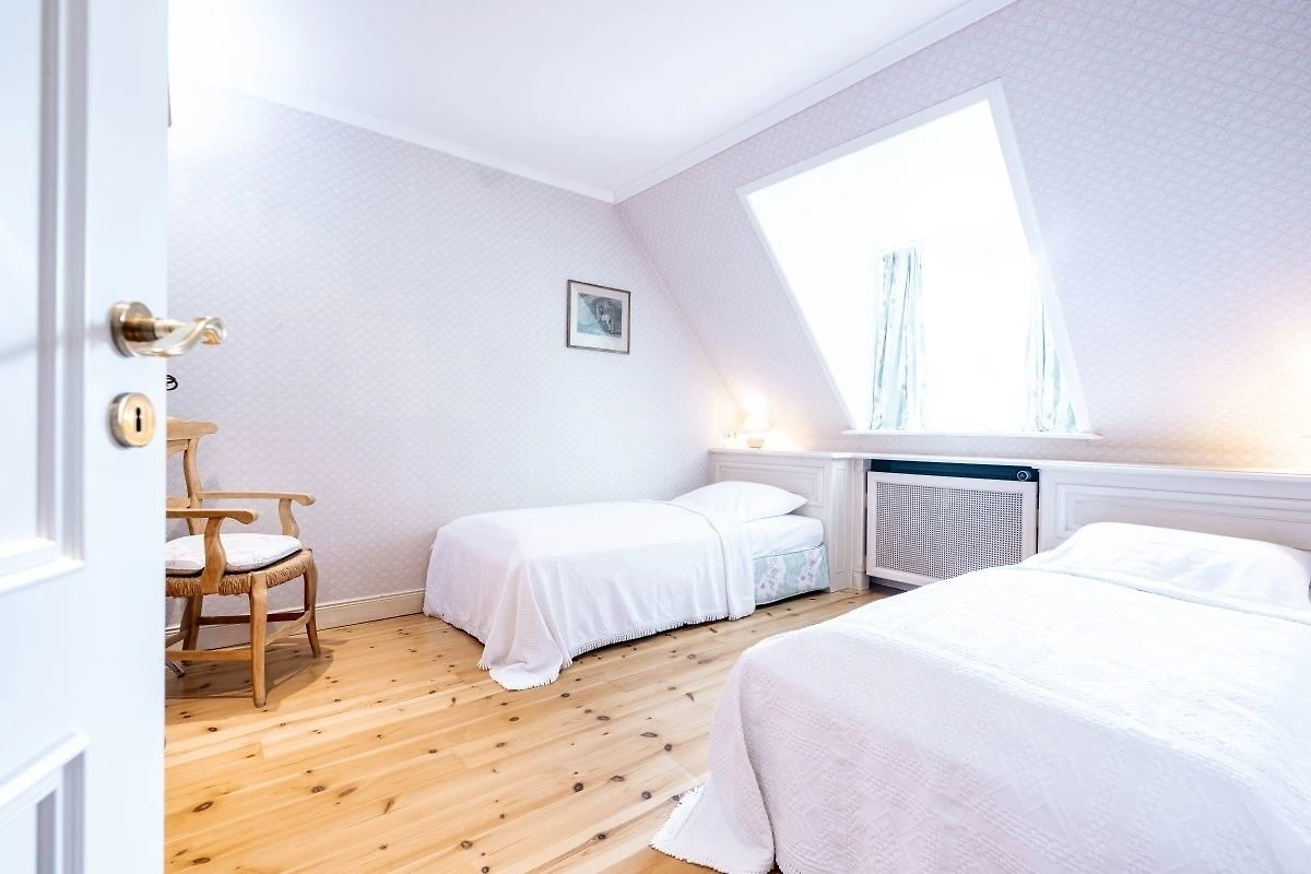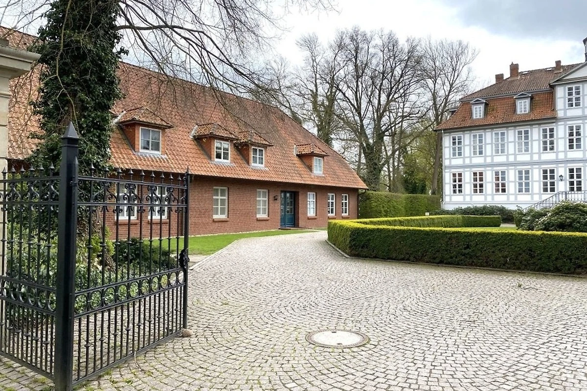 Auf der einen Seite hat man einen direkten Blick auf das Herrenhaus mit seinem Rondell, auf der anderen Seite blickt man in den ruhigen Garten. Ein Stellplatz für das Auto befindet sich nur wenige Meter entfernt.