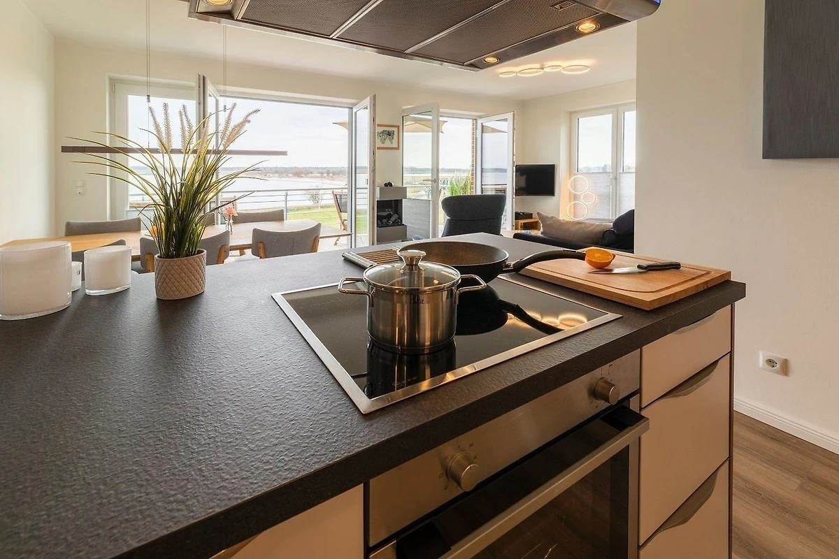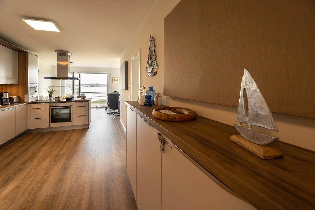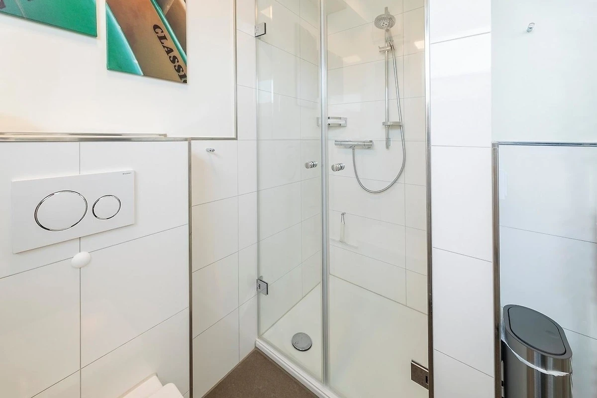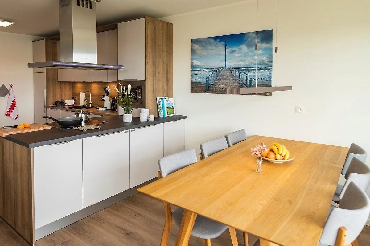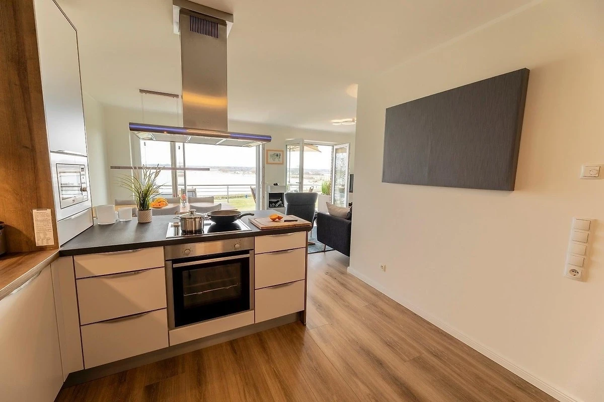 Die Ferienwohnung „Schöne Aussicht“ bietet Platz für vier Personen und beeindruckt mit einem unvergleichlichen Blick auf den weissen Sandstrand und die Ostsee. Der helle Wohnraum mit grosser Fensterfront lädt mit einem gemütlichen Sofa, einem Esstisch und einem grossen Fernseher zur Entspannung ein. Die offene Küche ist modern gestaltet und vollständig ausgestattet, einschliesslich Induktionsherd, Backofen, Kühlschrank mit Gefriervöglichkeit, sowie Geschirrspüler. Zwei Schlafzimmer mit en Suite Duschbädern, Ruf Boxspringbetten und Fernsehern garantieren Komfort. Die bodentiefen Duschen sind mit Glastüren versehen und bieten moderne Annehmlichkeiten wie Handtuchwärmer. WLAN ist verfügbar, und eine Sauna ergänzt das Angebot. Ein Fahrstuhl im Haus sowie ein eigener Stellplatz sorgen für zusätzlichen Komfort.