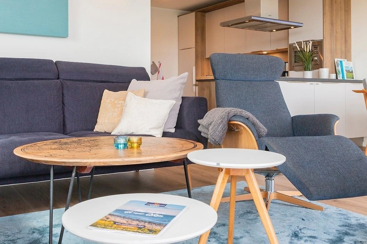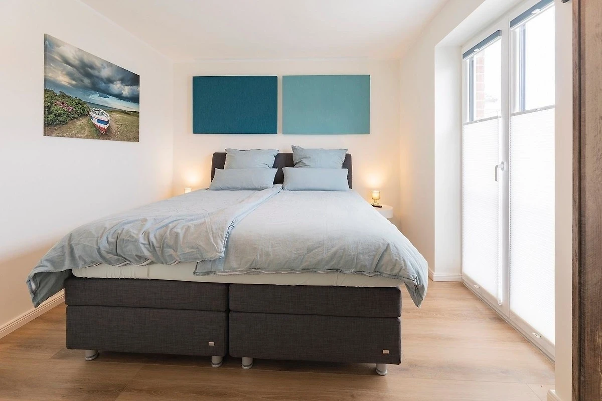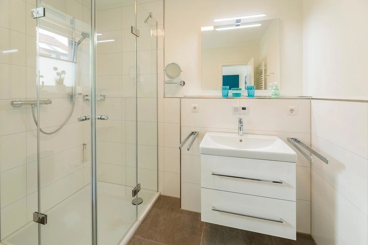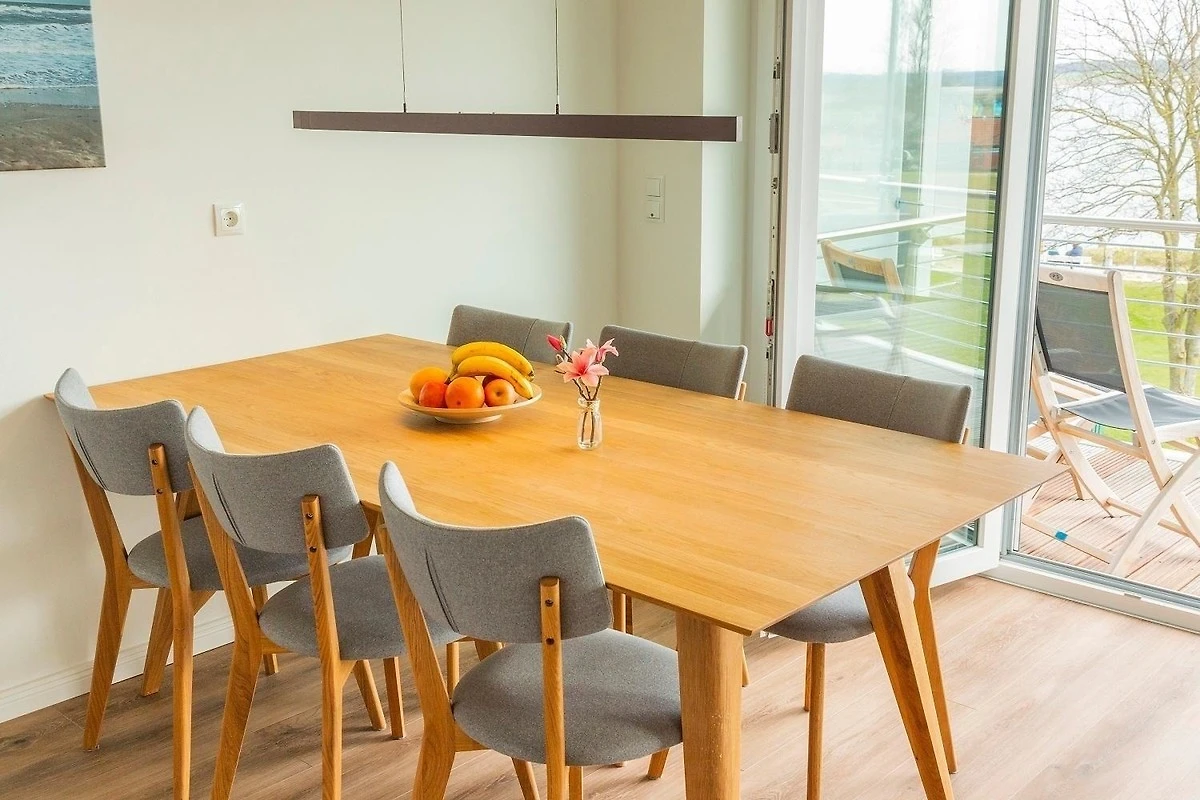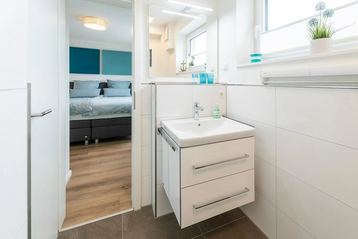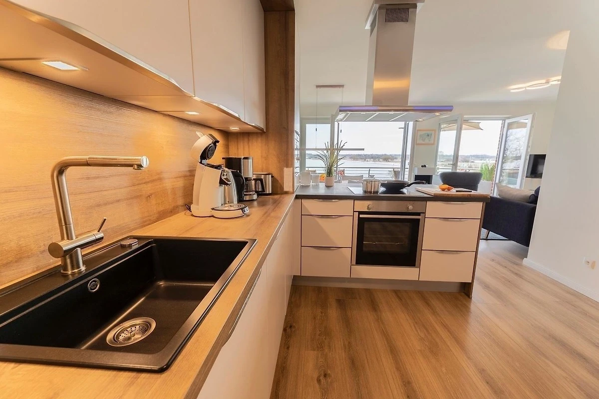 Die Ferienwohnung „Schöne Aussicht“ bietet Platz für vier Personen und beeindruckt mit einem unvergleichlichen Blick auf den weissen Sandstrand und die Ostsee. Der helle Wohnraum mit grosser Fensterfront lädt mit einem gemütlichen Sofa, einem Esstisch und einem grossen Fernseher zur Entspannung ein. Die offene Küche ist modern gestaltet und vollständig ausgestattet, einschliesslich Induktionsherd, Backofen, Kühlschrank mit Gefriervöglichkeit, sowie Geschirrspüler. Zwei Schlafzimmer mit en Suite Duschbädern, Ruf Boxspringbetten und Fernsehern garantieren Komfort. Die bodentiefen Duschen sind mit Glastüren versehen und bieten moderne Annehmlichkeiten wie Handtuchwärmer. WLAN ist verfügbar, und eine Sauna ergänzt das Angebot. Ein Fahrstuhl im Haus sowie ein eigener Stellplatz sorgen für zusätzlichen Komfort.