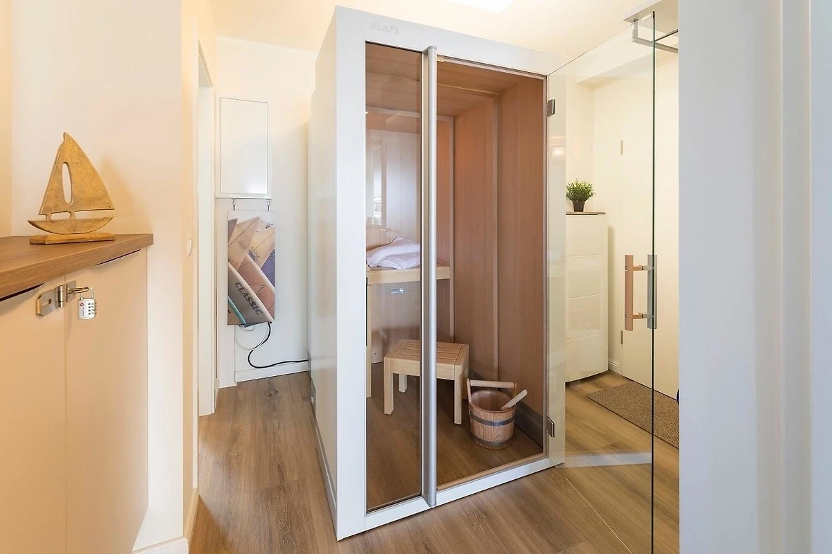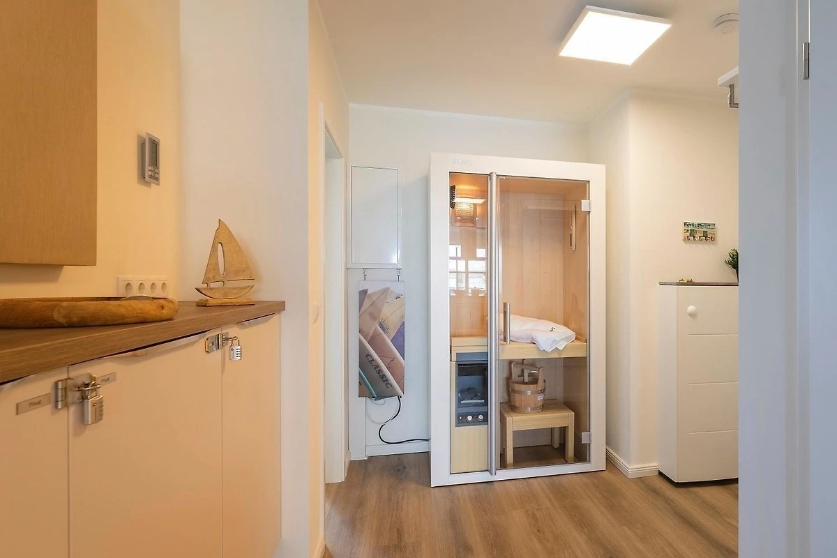 Die Ferienwohnung überzeugt mit einem privaten Parkplatz und einem erholsamen Saunabereich. Im Aussenbereich befindet sich ein gemütlicher Strandkorb, der zu entspannten Stunden im Freien einlädt. Der herrliche Meerblick rundet das Angebot ab und schafft eine entspannte Atmosphäre, ideal für erholsame Urlaubstage. Hier wird Entspannung grossgeschrieben.