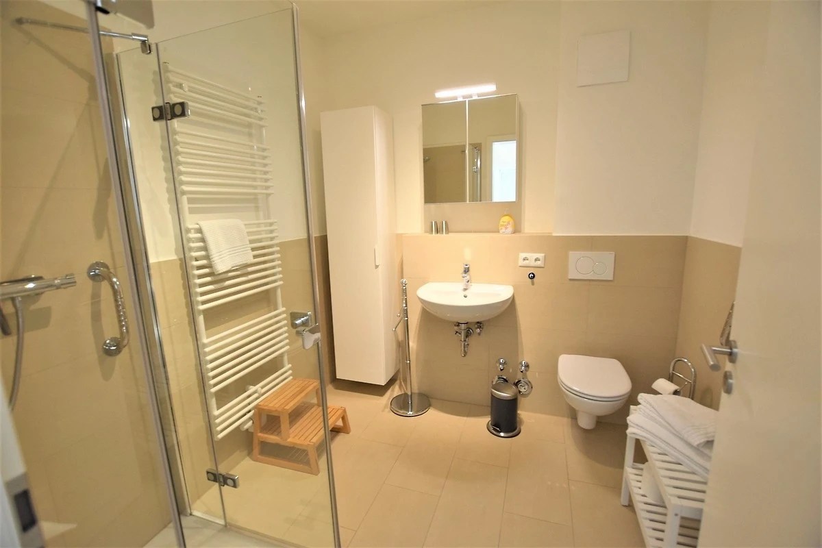 Diese Ferienwohnung bietet auf 79 Quadratmetern Platz für bis zu 4 Personen und zeichnet sich durch eine barrierefreie Ausstattung aus. Der grosszügige Wohn-Essbereich von 28 Quadratmetern ist mit einem grossen Fernseher ausgestattet. Die beiden Schlafzimmer umfassen ein Doppelbett (180x200) und ein Ausziehbett (160x200). Die hochwertige, komplett eingerichtete Küche bietet viel Stauraum. Das geräumige Badezimmer verfügt über eine Dusche, WC und eine angenehme Fussbodenheizung. WLAN ist ebenfalls verfügbar. Zusätzlich stehen in der Wohnung ein Strandkorb und ein eigener PKW-Stellplatz zur Verfügung. Haustiere sind willkommen, und die Nebenkosten sind inklusive, abgesehen von der Endreinigung und Wäsche. Die Wohnung ist eine Nichtraucherunterkunft. Ein Spielplatz für Kinder befindet sich in der Nähe, und frische Brötchen sind im nur 200 Meter entfernten Edeka-Marktes erhältlich.