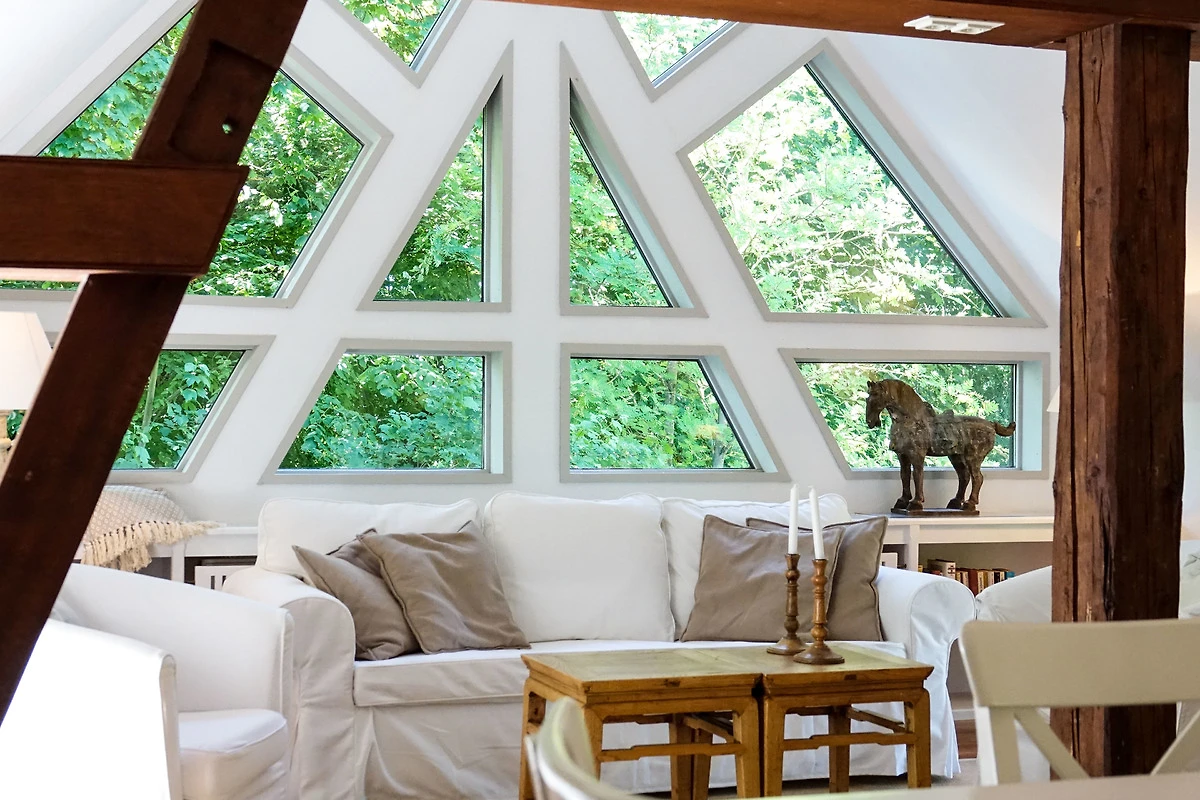 So besticht das Haus durch seine verwinkelte Aufteilung über drei Ebenen. Das grosse Wohnesszimmer mit historischen Balken ist durch sein architektonisch aussergewöhnliches Fenster lichtdurchflutet und öffnet den Blick auf die Baumwipfel.