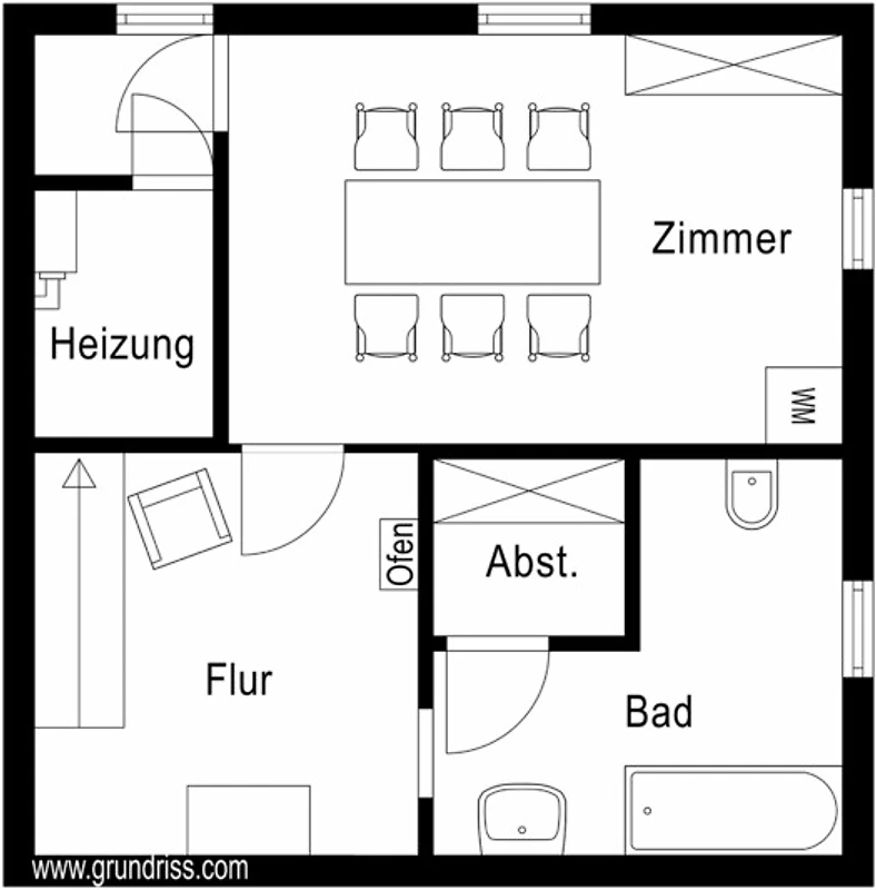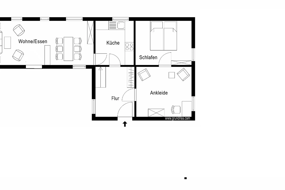 EG: Wohn-/Esszimmer, Küche, Doppelschlafzimmer mit Ankleidezimmer und Aufbettungsmöglichkeit