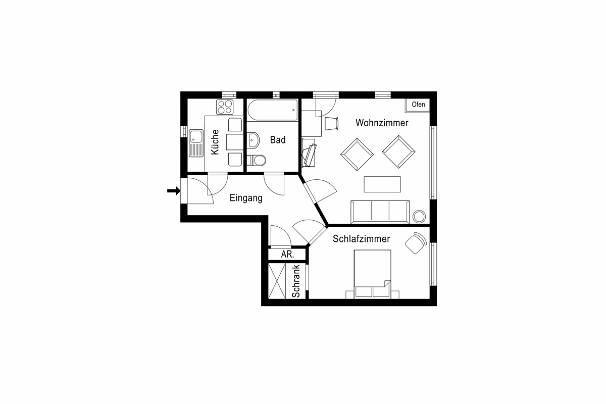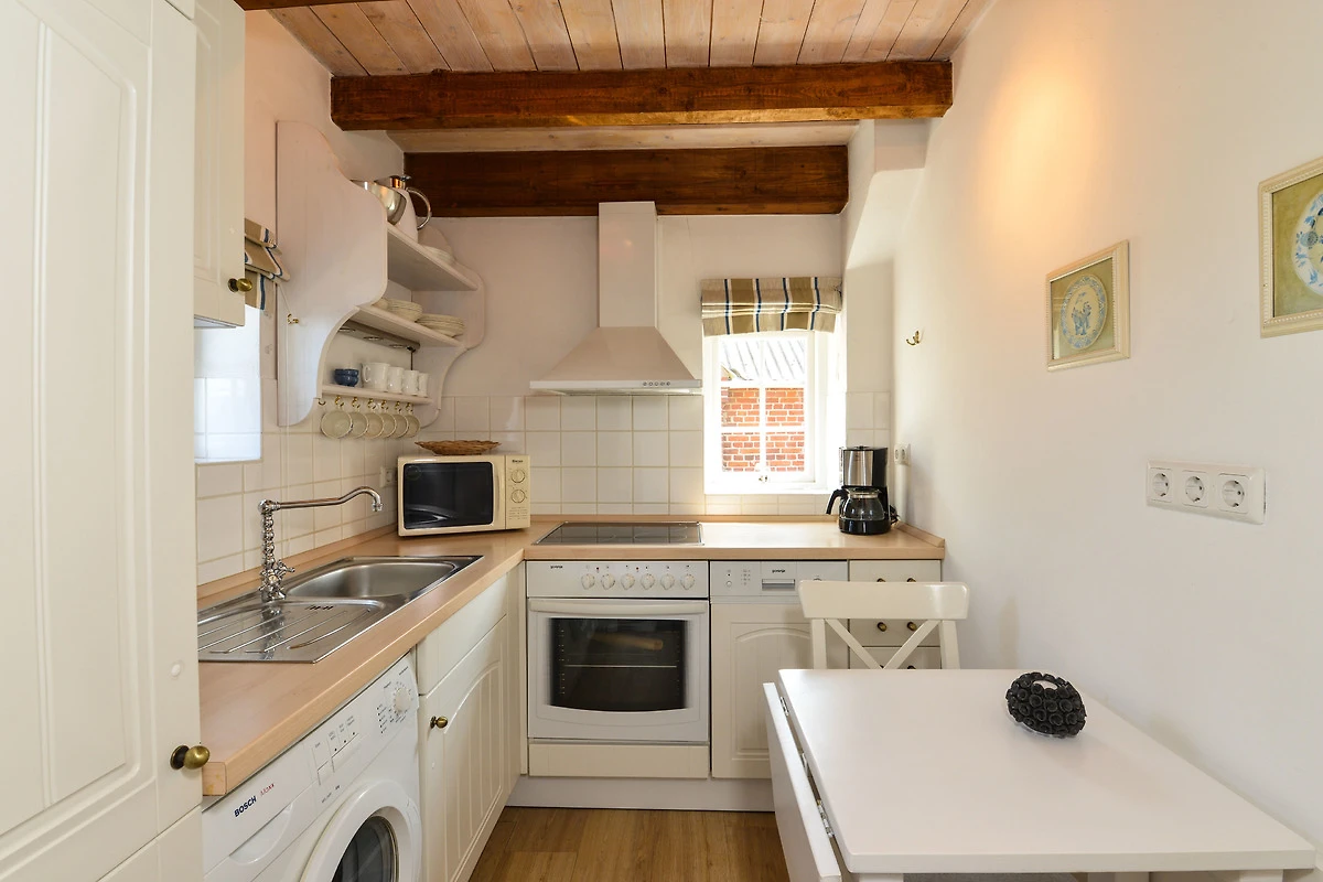 Wohnzimmer mit Wasserblick, kleine Küche mit Esstisch, Bad mit Dusch-Badewanne, ein Doppelschlafzimmer