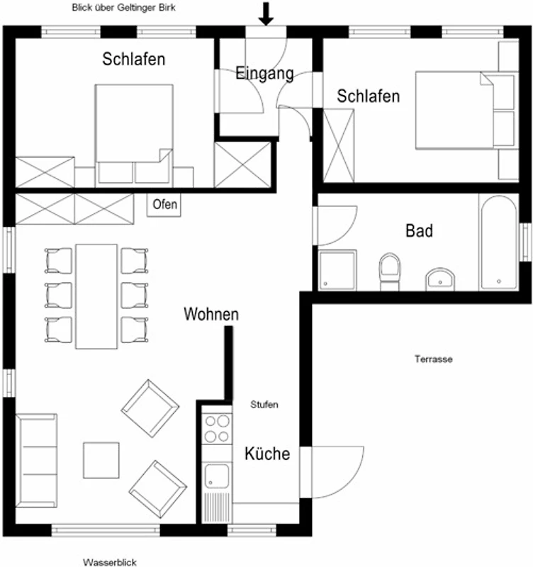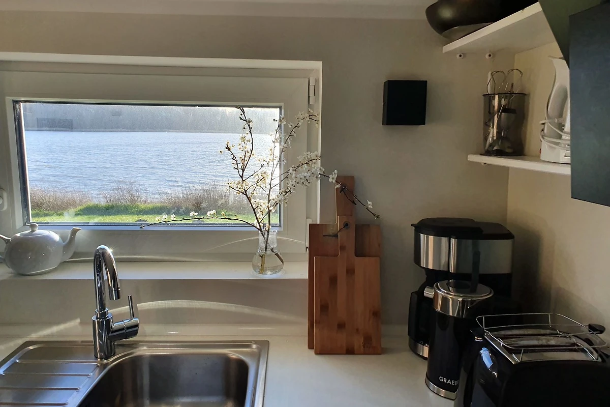 Wohn-Esszimmer mit Kaminofen und Wasserblick, kleine Küche mit Ausgang zu Terrasse und Garten, 2 Doppelzimmer, Bad mit bodengleicher Dusche und Badewanne