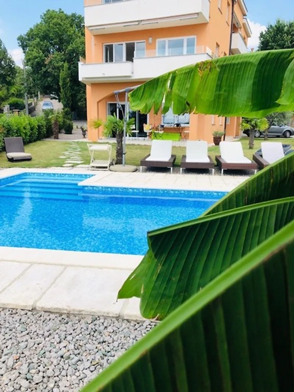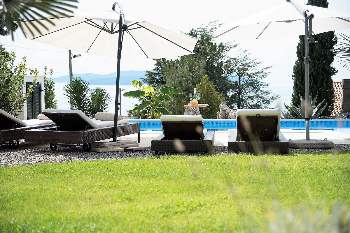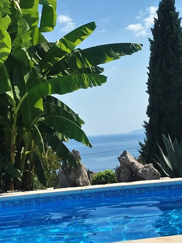 Das mit Lorbeer- Grün eingezäuntes Grundstück hat einen 250 qm grossen, kinderfreundlichen Garten mit Rasen und Pflanzen. In Verbindung aus Komfort und Luxus befindet sich ein Pool (7m x 3.5m x 1.5m), mit atemberaubendem Ausblick über die ganze Kvarner-Bucht, der an warmen Sommertagen für Abkühlung und Vergnügen sorgt. Natürlich gehört zum Pool noch eine Aussendusche sowie 7 Sonnenliegen mit zwei grossen Sonnenschirmen. Der Parkplatz befindet sich auf dem Grundstück (Schattenseite), der mit zwei automatischen Tore komlett eingezäunt ist.