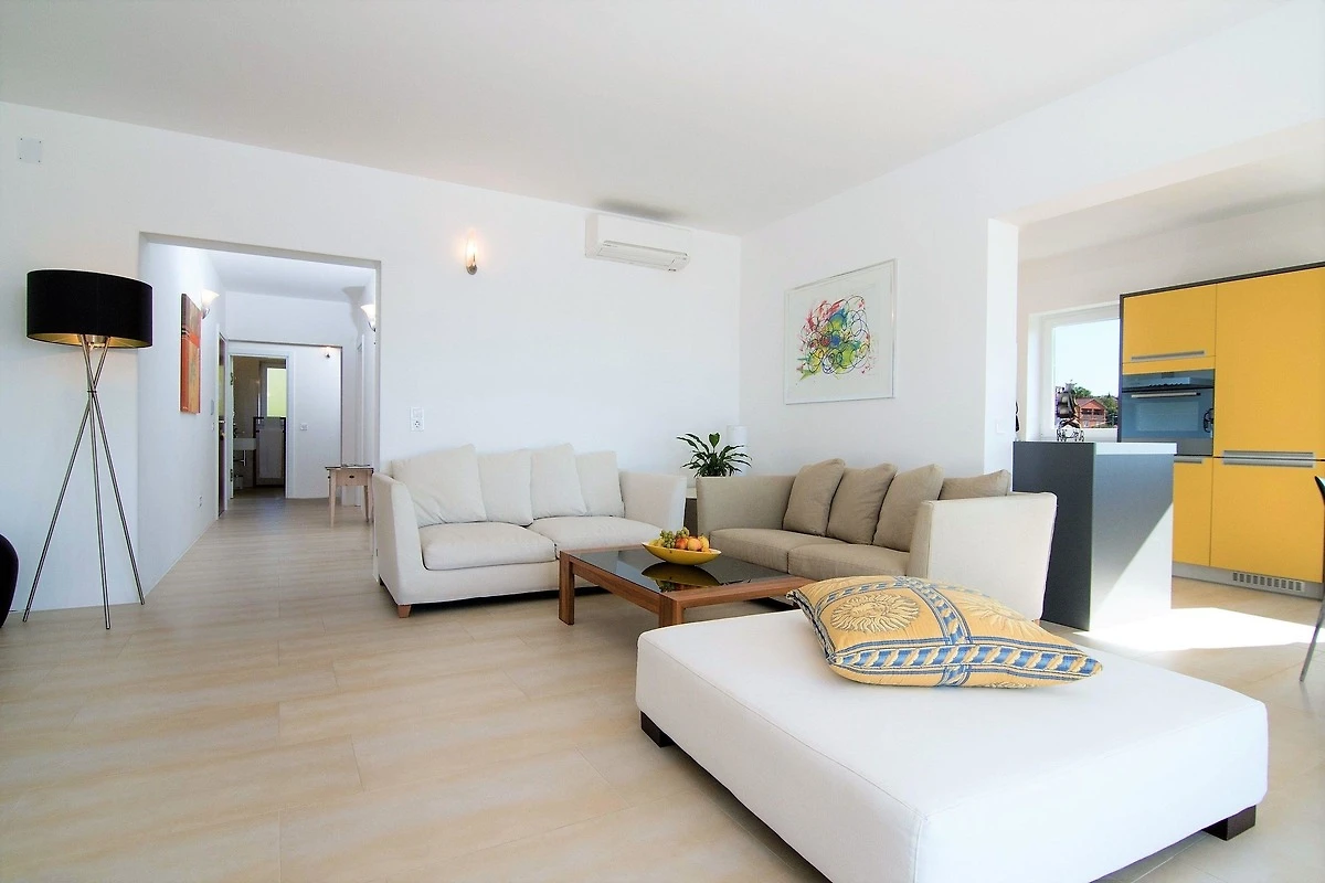 Mit einer Wohnfläche von 115 qm bietet die Ferienwohnung viel Platz für 6 Personen. Alle Räume sind gepflegt, luxuriös und mit modernem Komfort eingerichtet. Die Wohnung hat ein sehr grosses und helles Wohnzimmer, das mit einer Klimaanlage ausgestattet ist; einen gemütlichen Sitzbereich mit einem Flachbildschirmfernseher.