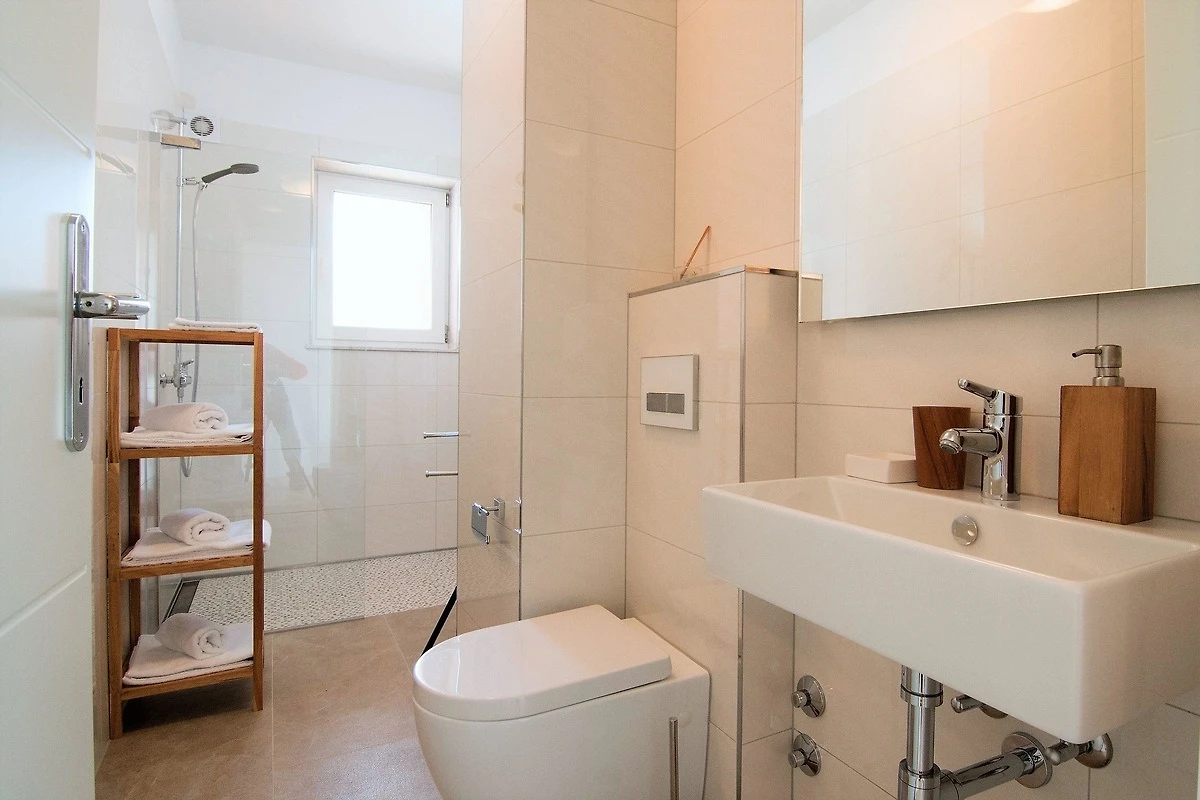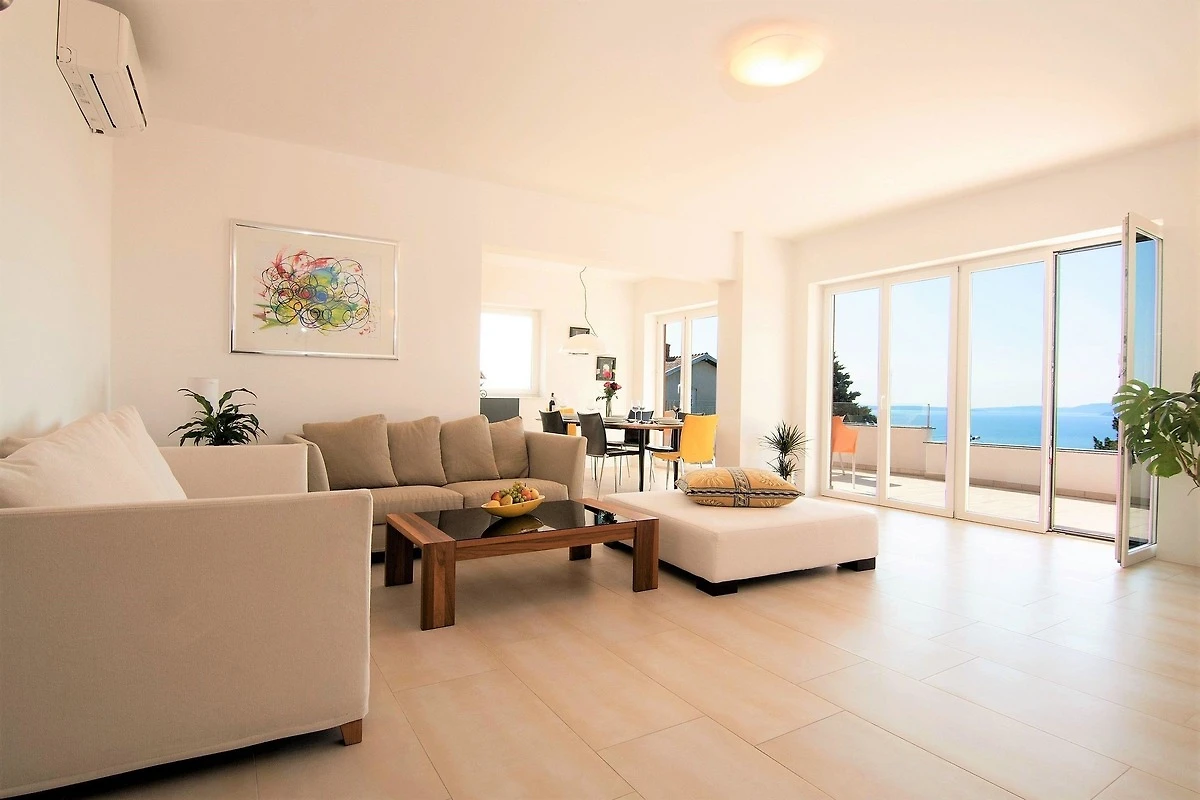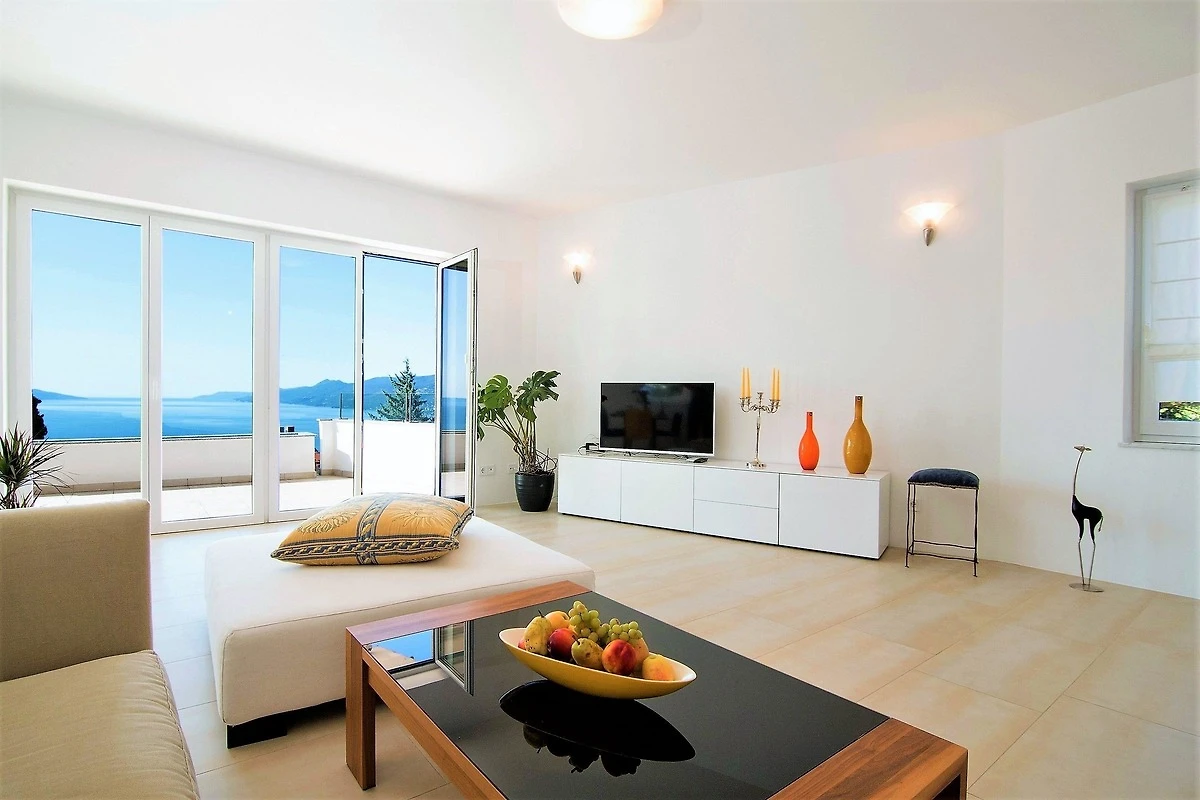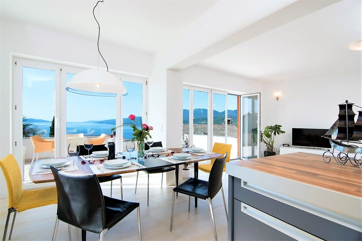 Aus dem Wohn-und Essbereich gelangt man direkt auf die Terrasse. Von da aus geniessen sie die herrliche Umgebung und die entspannte mediterrane Atmosphäre. Der traumhafte Essbereich, mit dem Ausblick auf die ganze Kvarner- Bucht, für 6 Personen befindet sich gleich neben der topmoderner Küche. Diese ist mit einer Induktion- Cerankochfeld, Backofen, Geschirrspüler, Mikrowelle, Kühlschrank mit Tiefkühler, Toaster und zwei Kaffeemaschinen (Kolben und Filter) ausgestattet.