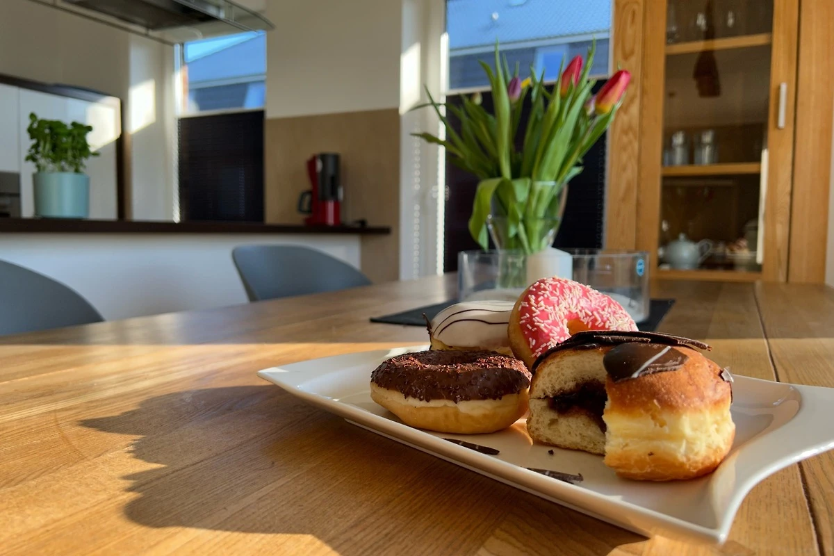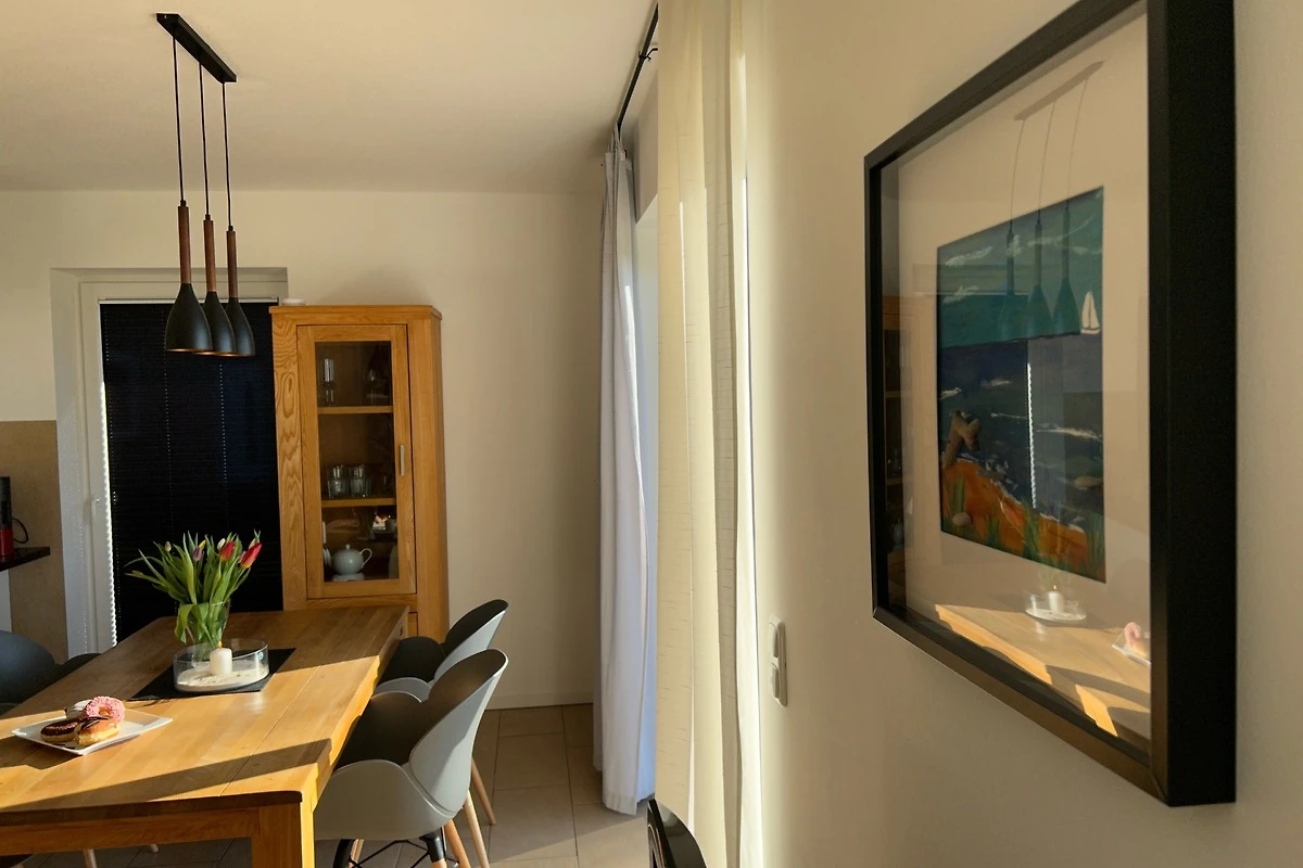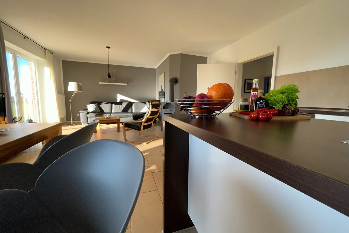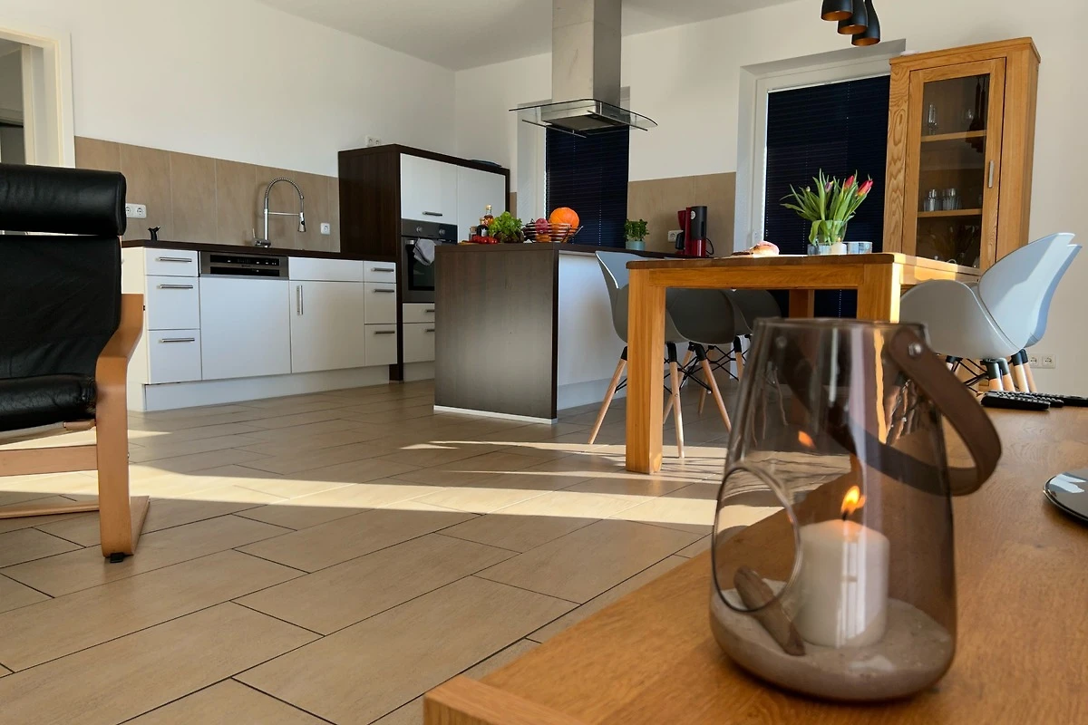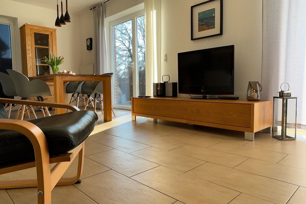 Aus diesem lichtdurchflutetem Raum kann man über vier Terrassentüren auf die Süd-Westterrasse gelangen. Auf dieser stehen ein Strandkorb, ein Tisch mit ausreichend Sitzmöbeln, ein Grill und ein Sonnenschirm.