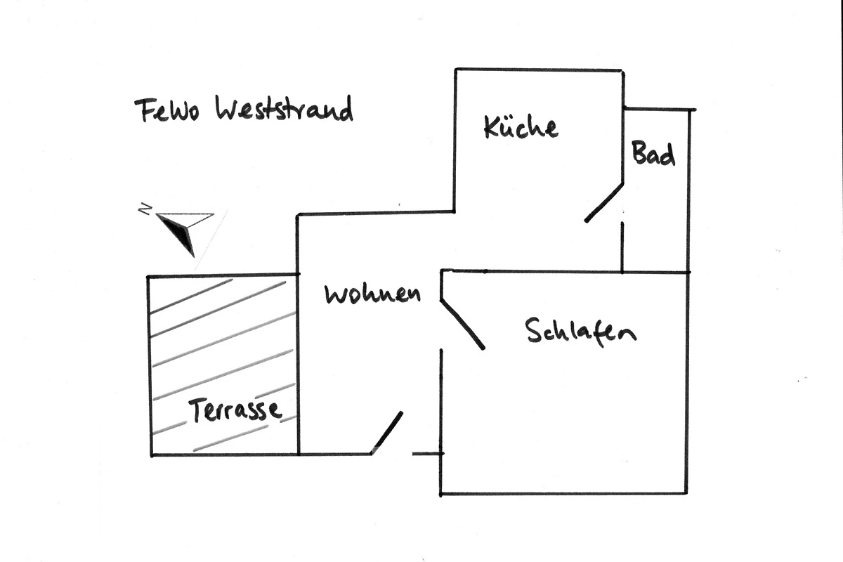 Die Wohnung Weststrand mit separatem/eigenem Eingang ist 42 qm gross und verfügt über 1 Schlafzimmer mit Doppelbett und Einzelbett, 1 Wohnzimmer mit Sat-TV, 1 Bad mit Dusche und Föhn sowie 1 Küchenzeile mit Geschirrspüler, 4 Kochfeldern, Mikrowelle, Kühlschrank mit Gefrierfach, Toaster, Kaffeemaschine und Wasserkocher. Bettwäsche buchbar ab 3 Nächten gegen Gebühr; Handtücher sind mitzubringen. Eine eigene Terrasse mit Gartenmobiliar ist direkt vor der Wohnung vorhanden. Unseren Gästen steht ein Grill im kleinen Garten sowie ein Parkplatz auf dem Grundstück zur Verfügung. Hausgäste können E-Autos bequem an der Unterkunft laden (Typ2, 11kw).