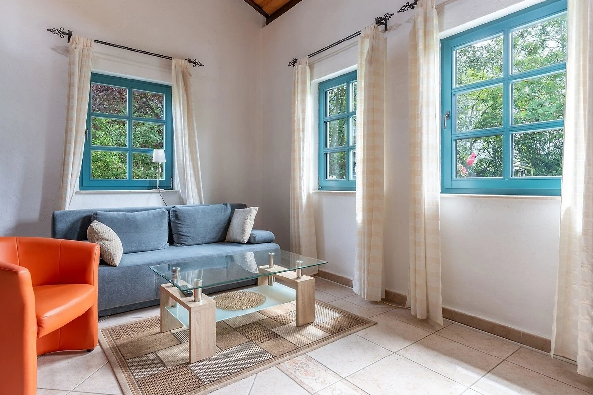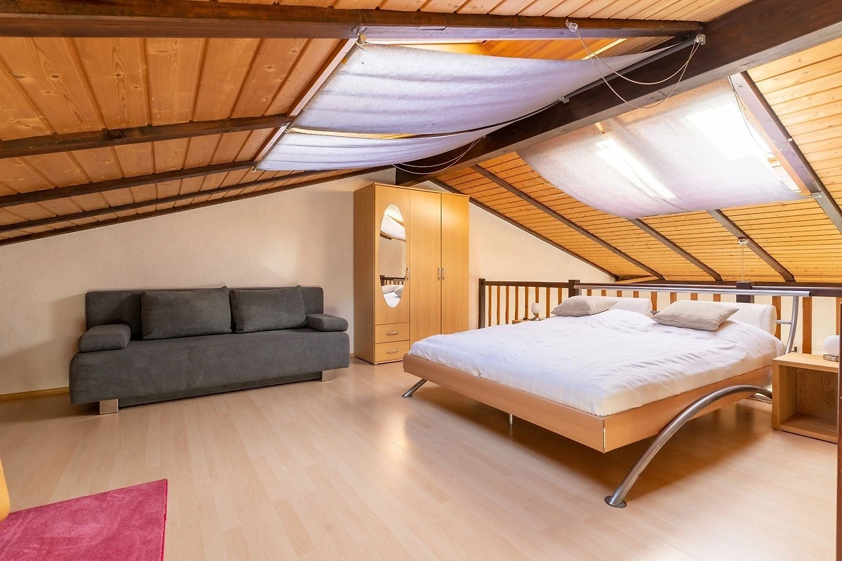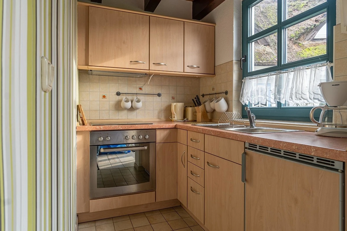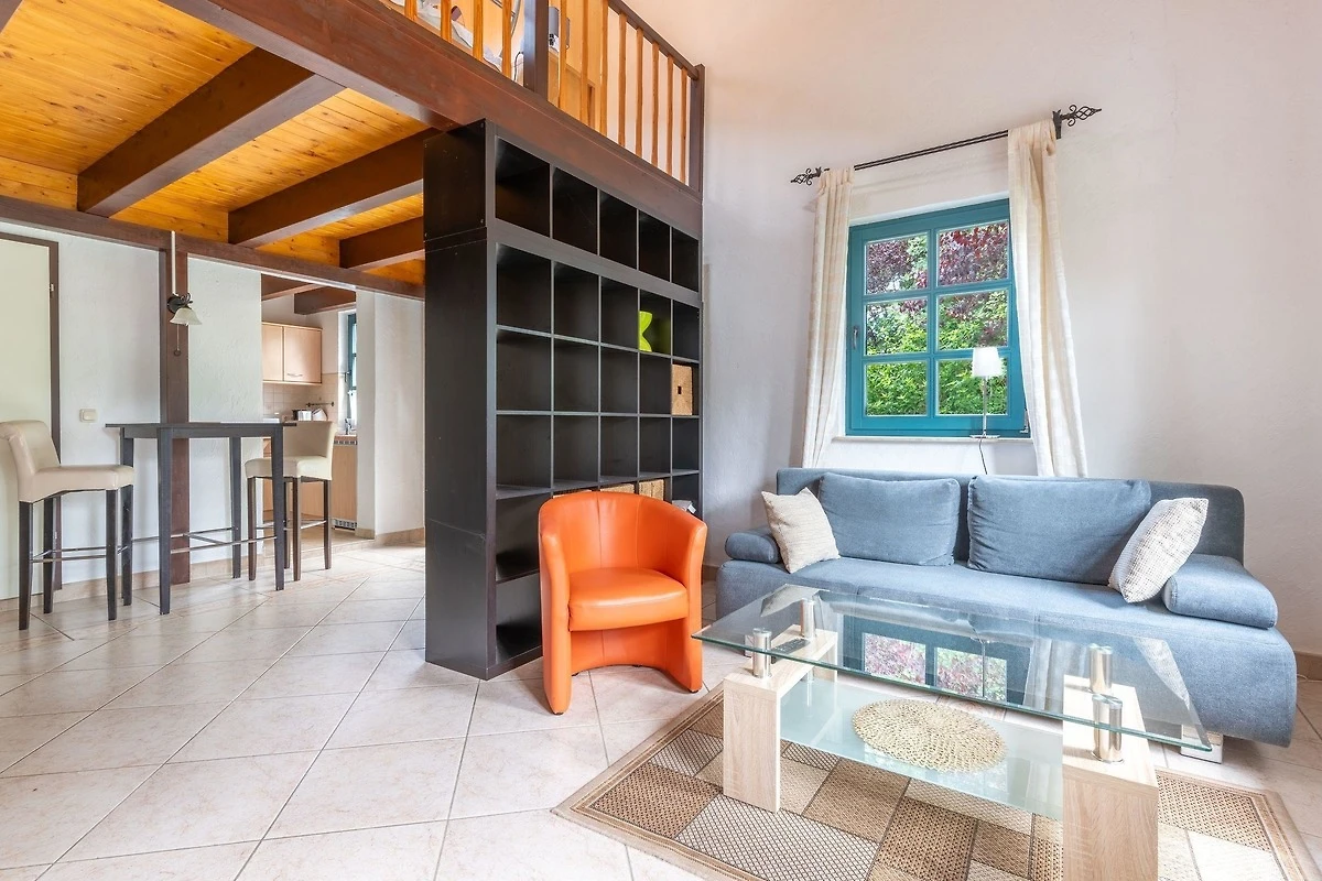 Die Ferienwohnung bietet auf 52 qm Platz für bis zu 2 Personen (Aufbettung 1 Person bis 10 Jahre möglich). Der Wohnbereich im Erdgeschoss verfügt über eine grosse Couch, TV und einen Essplatz. Die angrenzende Küche ist ausgestattet mit Herd, Backofen, Kühlschrank, mit Tiefkühlfach, Kaffeemaschine, Toaster, Wasserkocher.