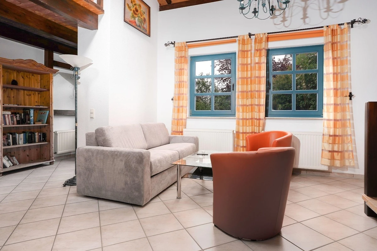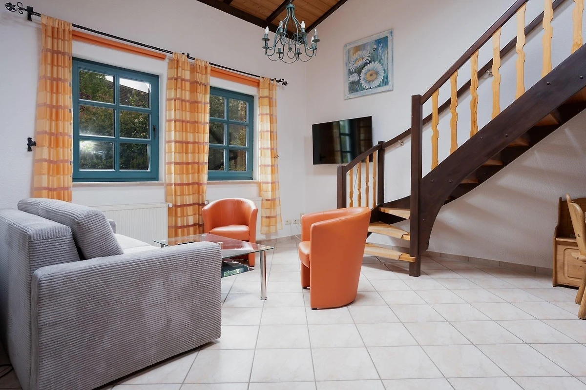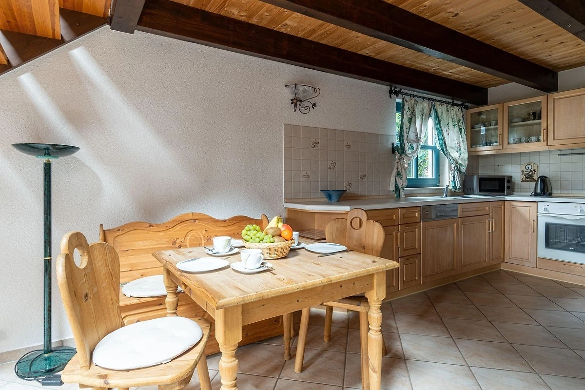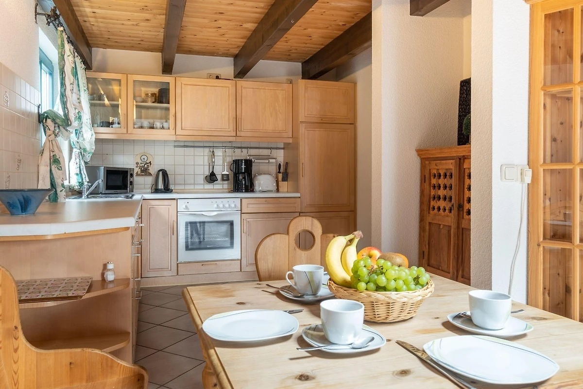Die Ferienwohnung Katja bietet auf 55 qm Platz für bis zu 3 Personen. Der Wohnbereich im Erdgeschoss verfügt über eine Schlafcouch für 2 Personen, TV und einen Essplatz für 4 Personen. Die angrenzende Küche ist ausgestattet mit Herd, Backofen, Kühlschrank, mit Tiefkühlfach, Geschirrspüler, Kaffeemaschine, Toaster, Wasserkocher.