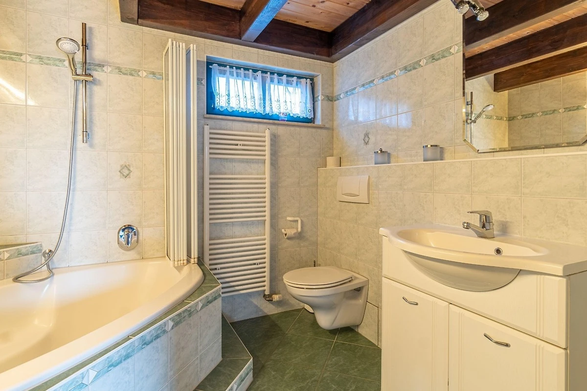 Im Erdgeschoss befindet sich auch das moderne Bad mit Eckbadewanne.