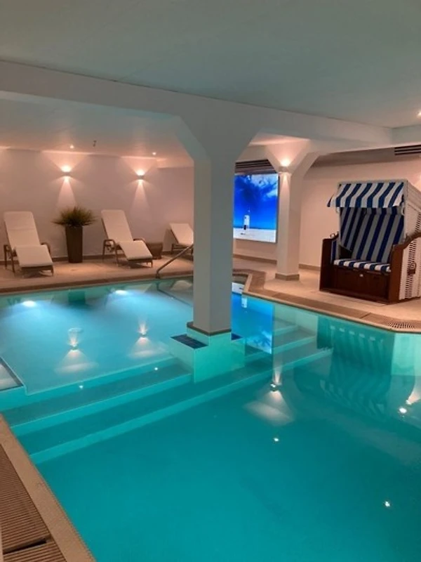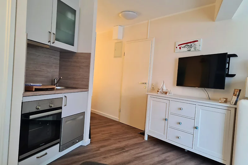 Im etwas abgetrennten Schlafbereich befindet sich ein grosses Boxspringbett (180 × 200 cm) und Kleiderschrank. Das Sofa mit Récamière lädt zum Relaxen nach dem Strandbesuch und zum gemütlichen Fernsehabend ein. Das 40-Zoll Sat.-TV kann im gesamten Apartment betrachtet werden.