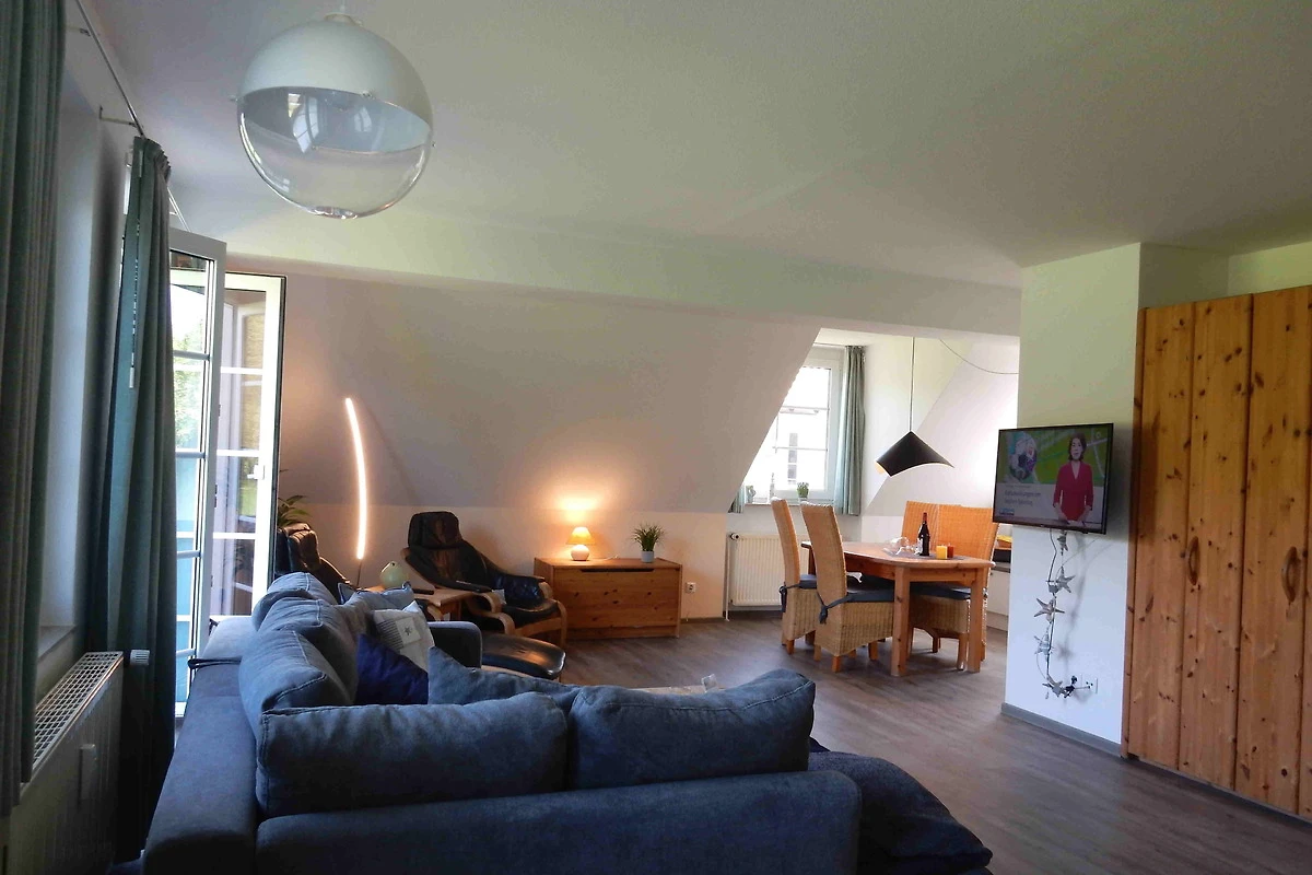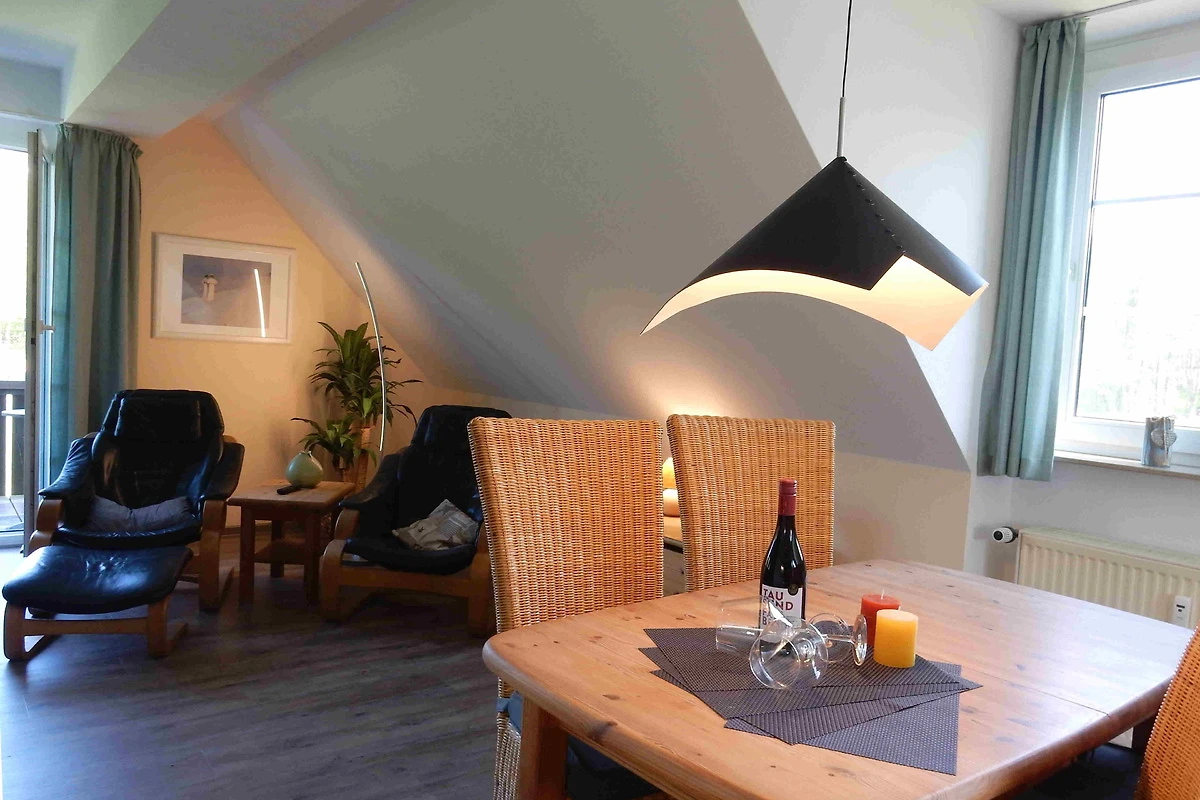 3 Zimmer-Maisonette ca. 75 qm für 2-6 Personen, Haus A in der Residenz Kormoran, Grüne Strasse 45A-R, Ostseebad Prerow. 1.OG: Wohnzimmer mit Schlafcouch, Sitzgarnitur, Kleiderschrank, SAT-TV/Radio, WLAN, Duschbad/WC, Balkon, Essecke mit Küchenzeile (Spülmaschine). 2.OG: 2 Schlafzimmer, 1x Doppelbett, 1x 2 Einzelbetten, Dusche/WC
