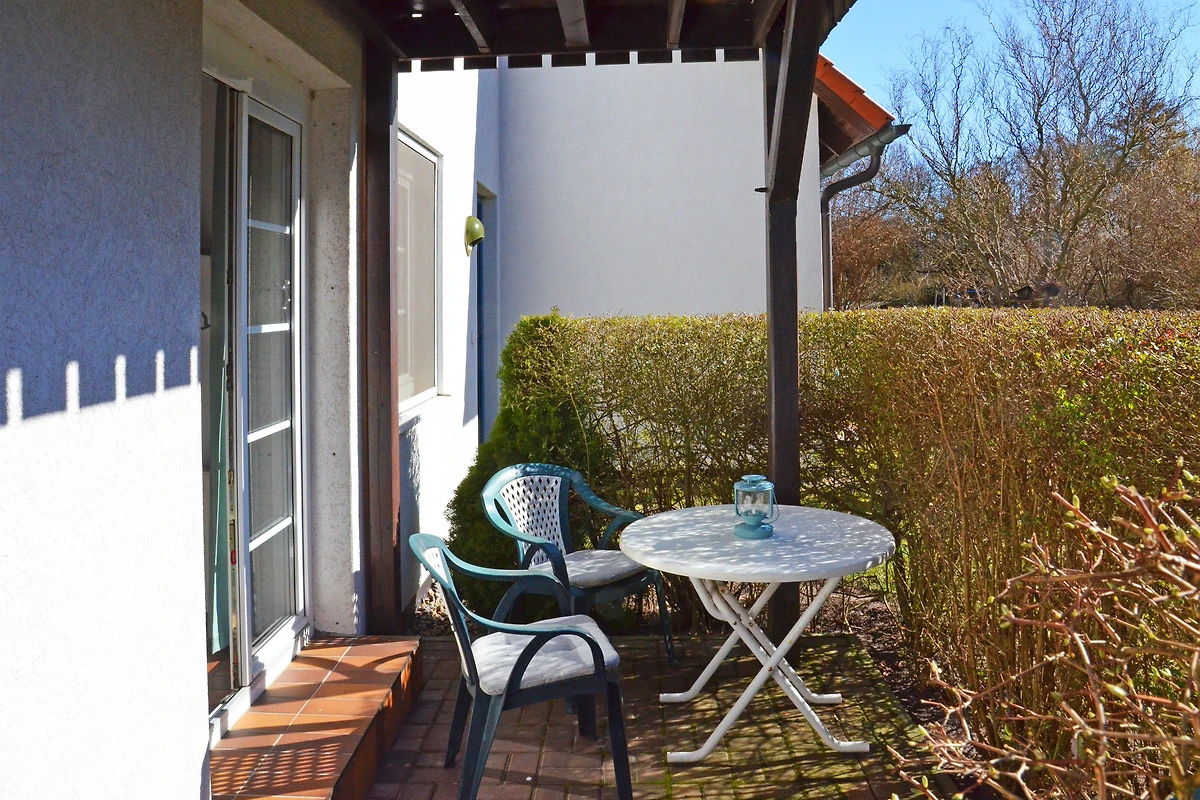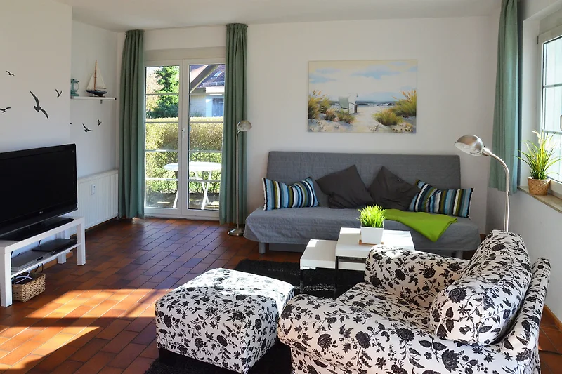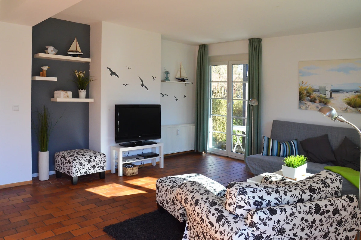 Darsskieker, 2 Zimmer ca. 54 qm, EG im Haus K, Residenz Kormoran, Grüne Strasse 45A-R, Ostseebad Prerow, für 1-4 Personen. Modern eingerichtet, Wohnzimmer mit Schlafcouch, WLAN, Sitzgarnitur, SAT-TV/Radio, moderne Küchenzeile (Backofen, Spülmaschine) Esstisch, Schlafzimmer mit Doppelbett, SAT-TV, Dusche/WC, extra WC, Terrasse.