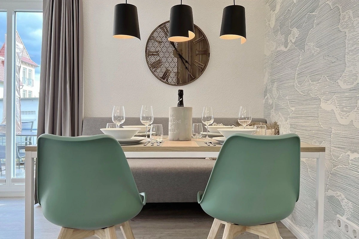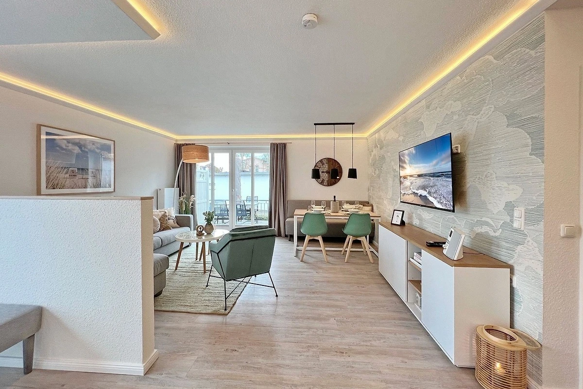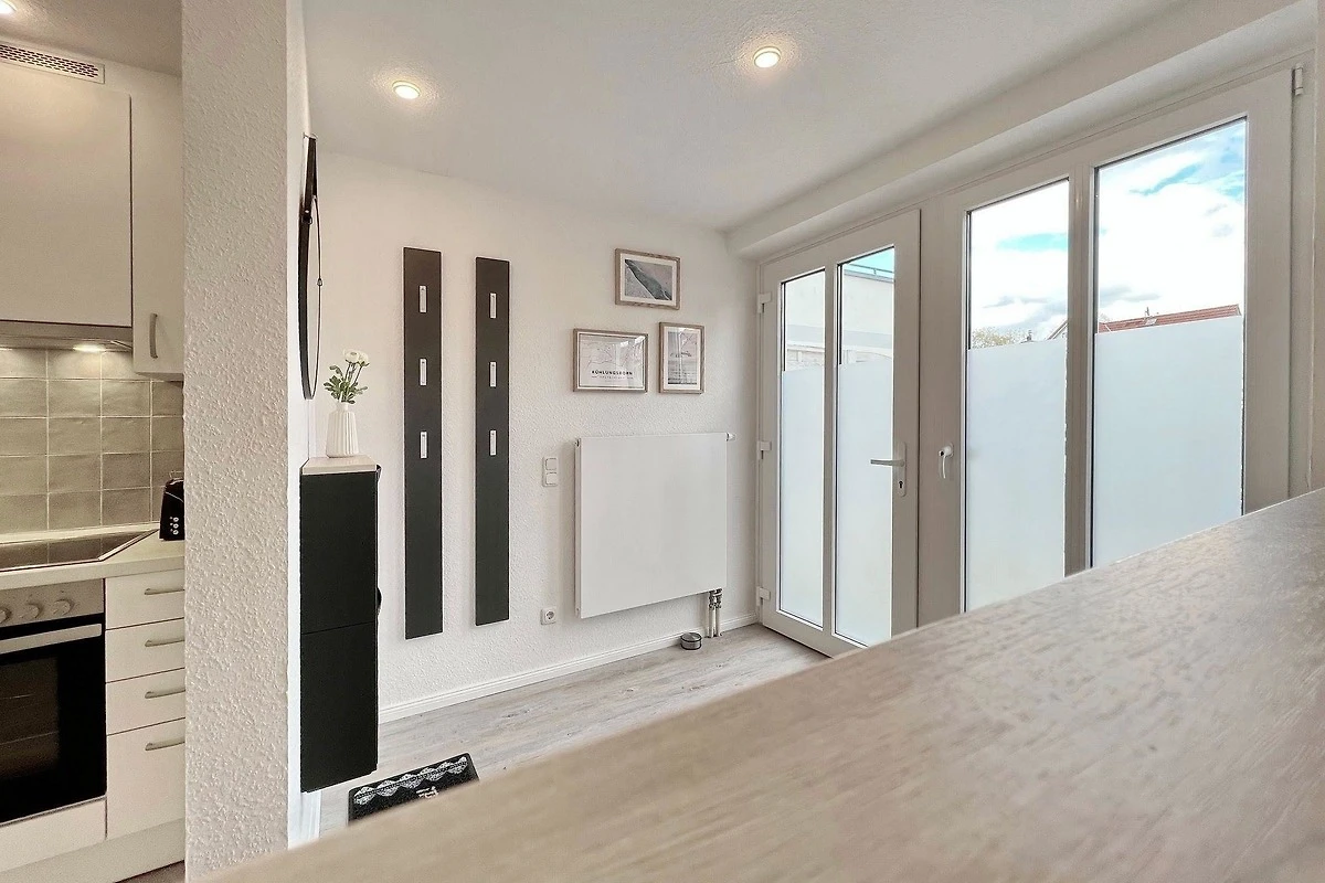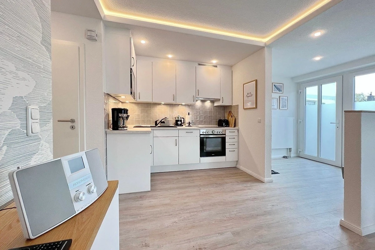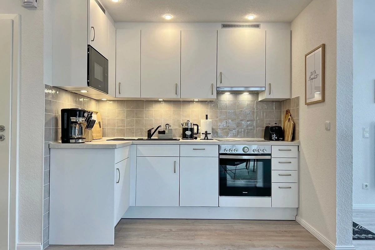 Das helle und freundliche, mit viel Liebe zum Detail eingerichtete 2-Zimmer-Apartment im Erdgeschoss wurde Anfang 2023 renoviert und verbindet Koch-, Ess- und Wohnbereich miteinander und lädt zu einem Gläschen Wein oder auch zum Kochen mit der ganzen Familie nach einem ereignisreichen Tag ein.