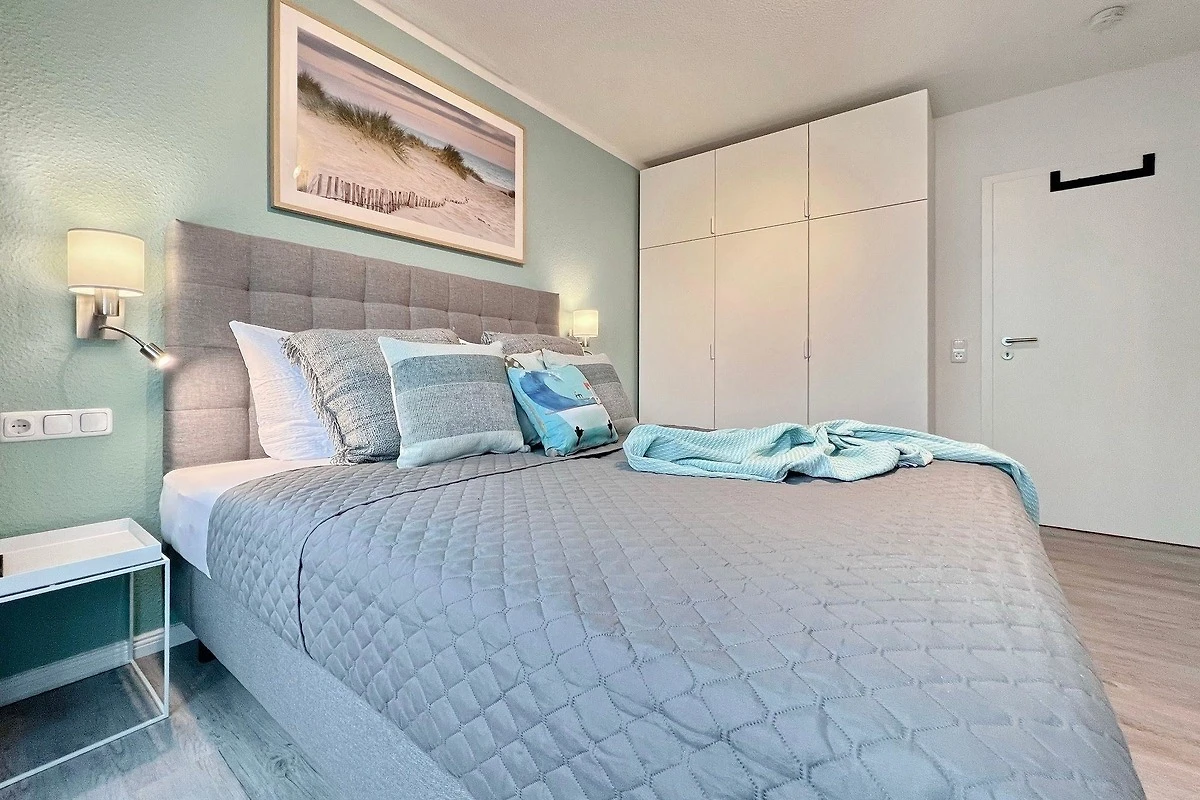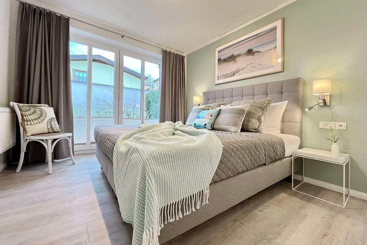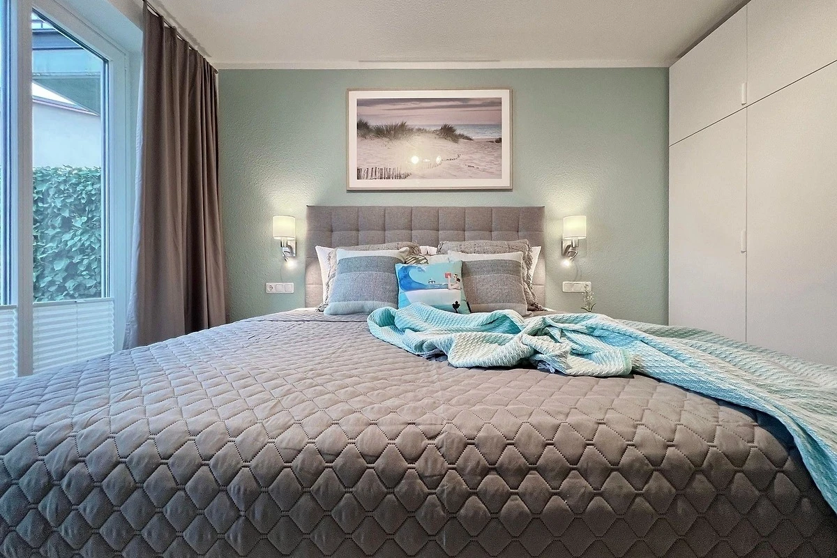 Das separate Schlafzimmer mit einem Boxspringbett garantiert einen erholsamen Schlaf und einen perfekten Start in den nächsten Urlaubstag.