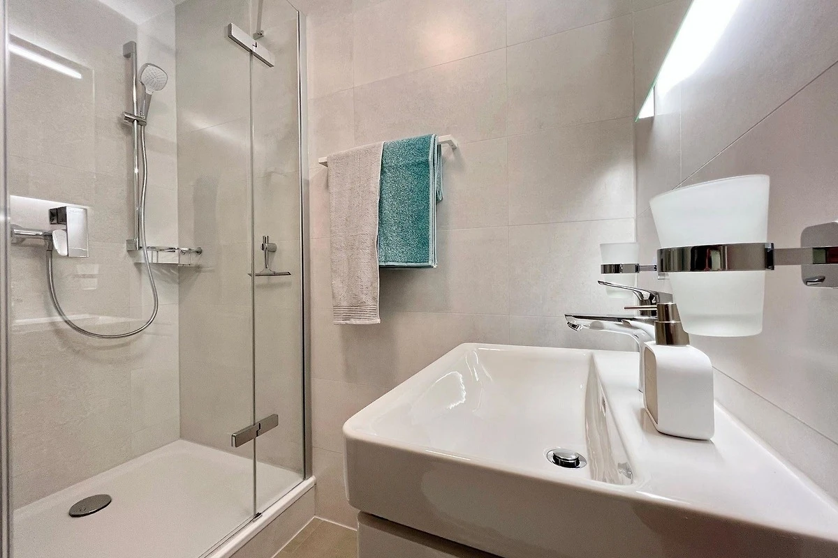 Im Badezimmer befinden sich eine Dusche, ein WC, ein Waschbecken mit Unterschrank sowie ausreichend Platz für Ihre Kosmetikartikel.