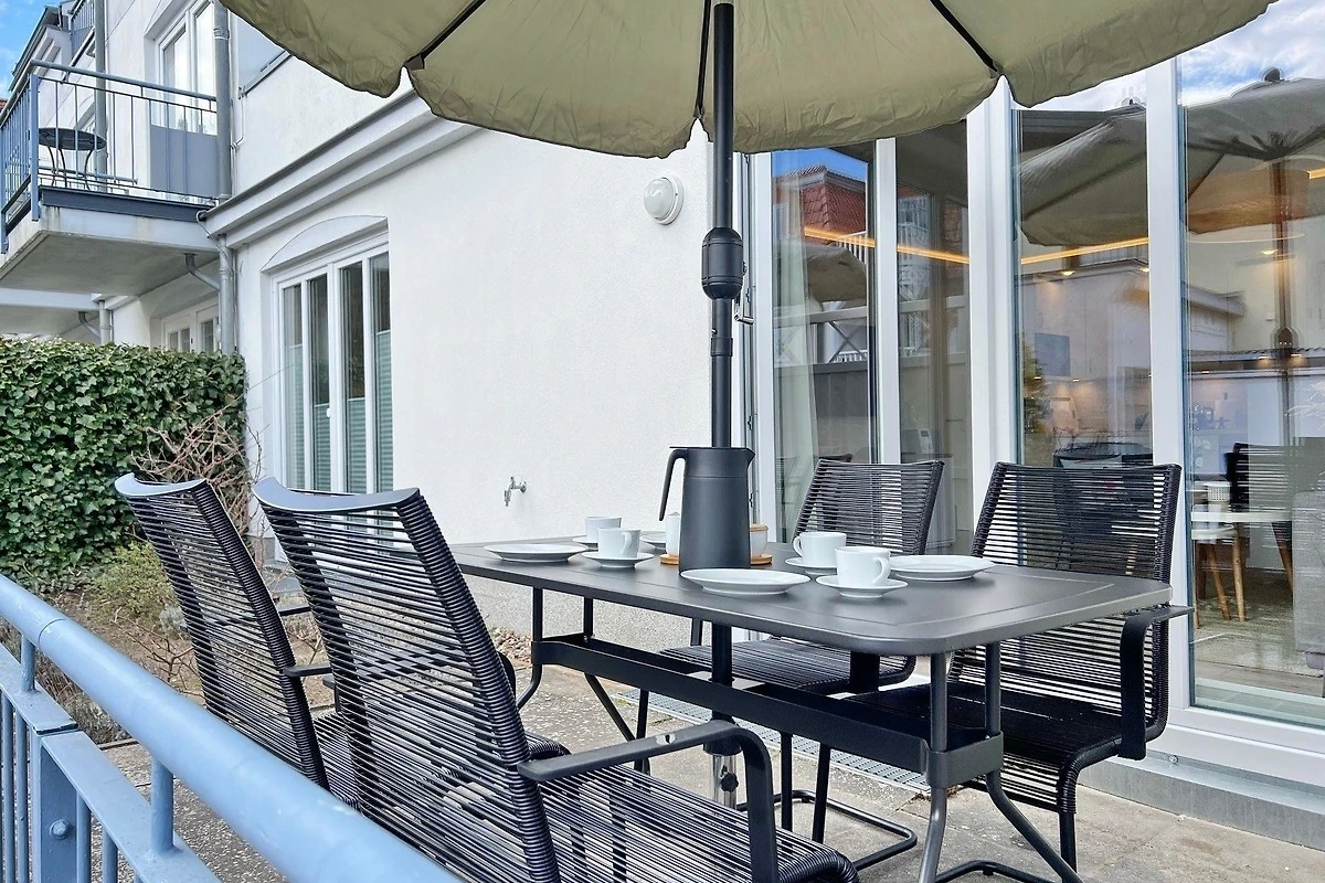 Die Terrasse ist mit modernen und bequemen Stühlen, einem Tisch sowie einem Sonnenschirm ausgestattet.