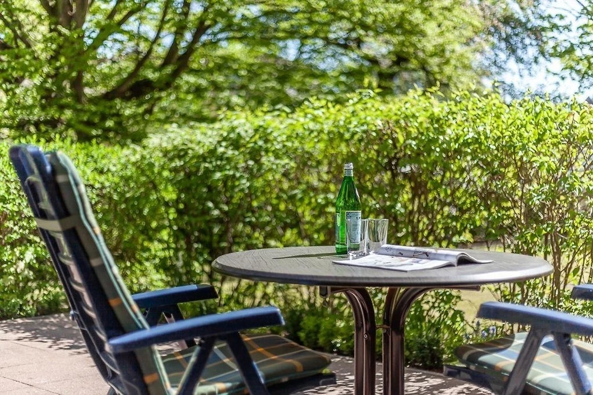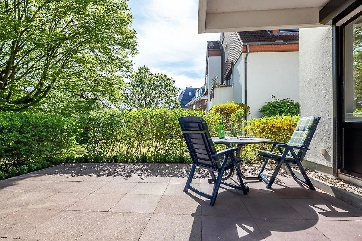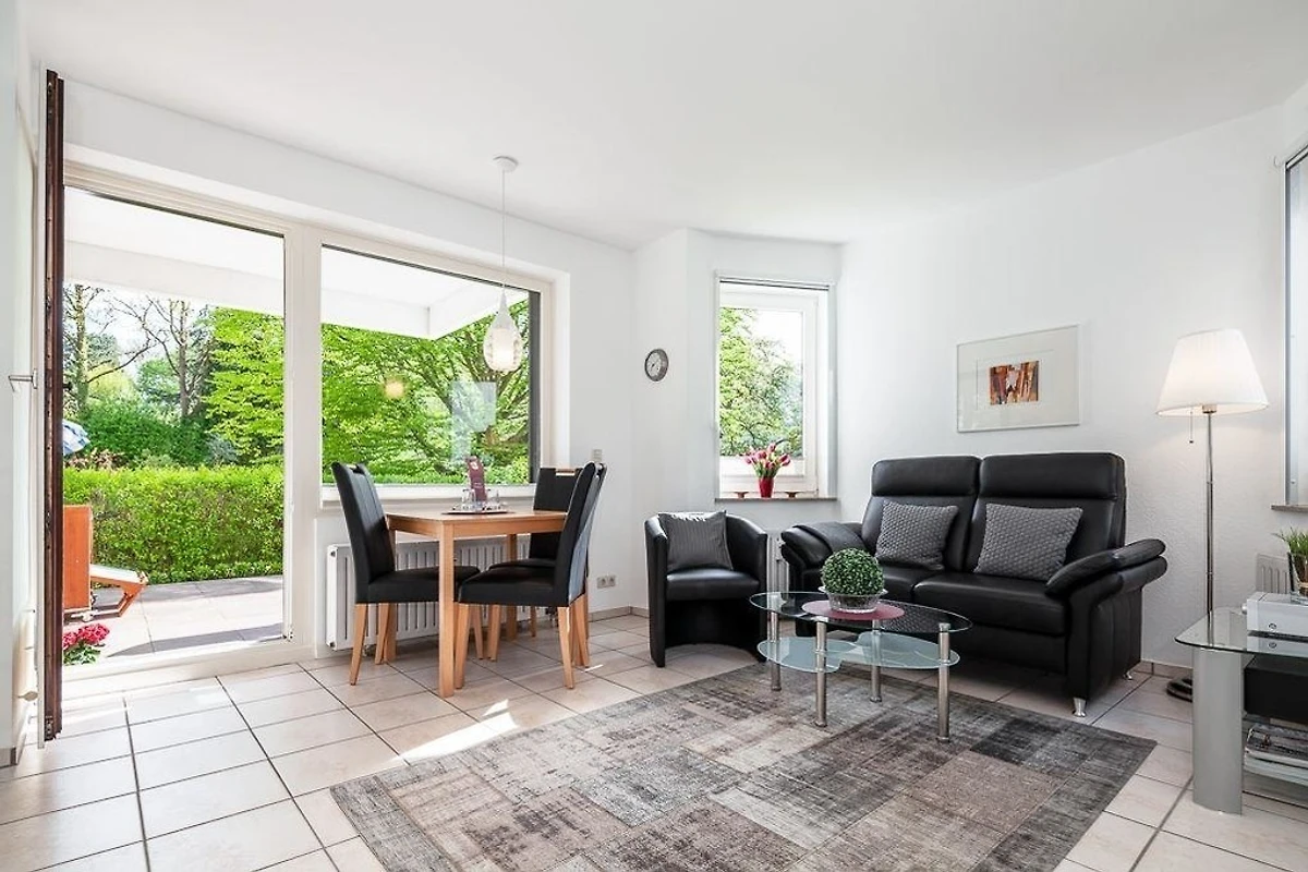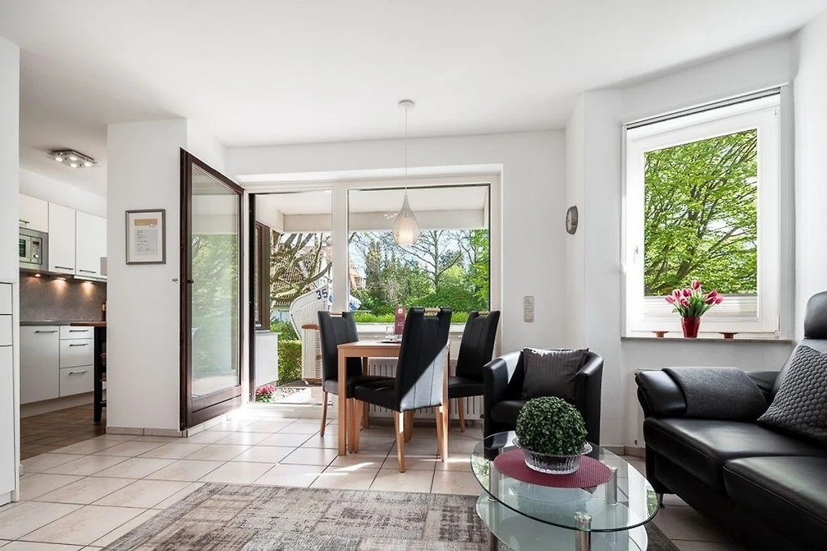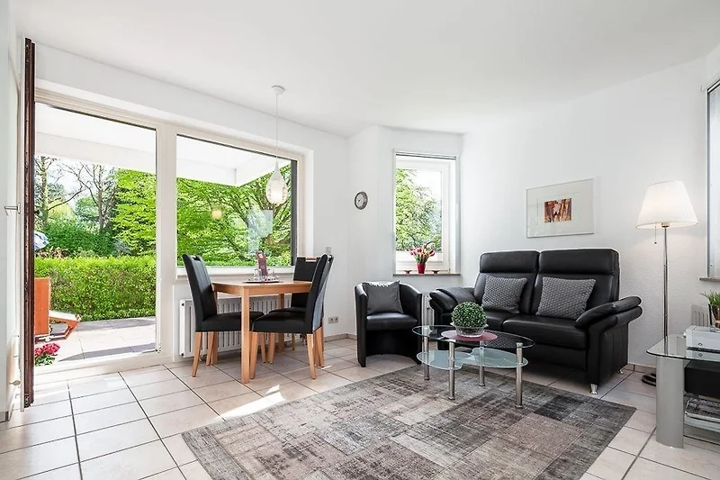 ein Couchtisch, die Musikanlage, ein Sideboard sowie der Flachbildschirm. Die Essecke mit 3 Stühlen steht direkt am Fenster mit Blick in den schönen Garten. Von hier haben Sie auch Zugang zu der grossen teilüberdachten Terrasse.