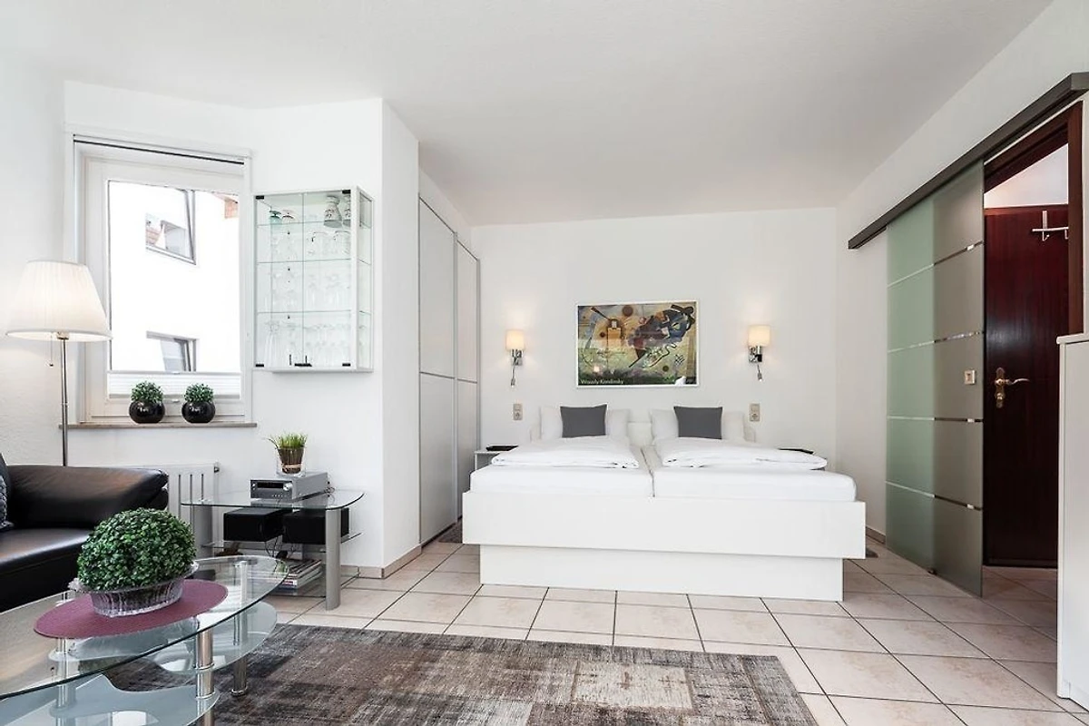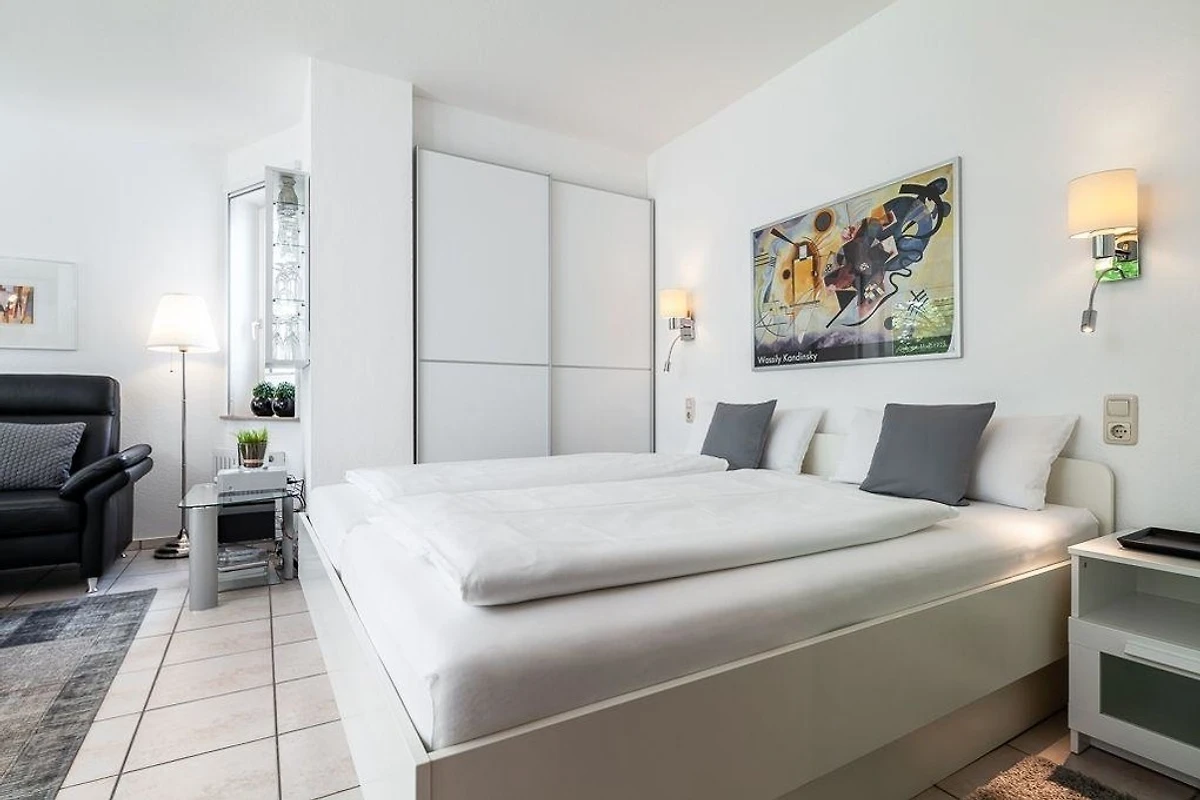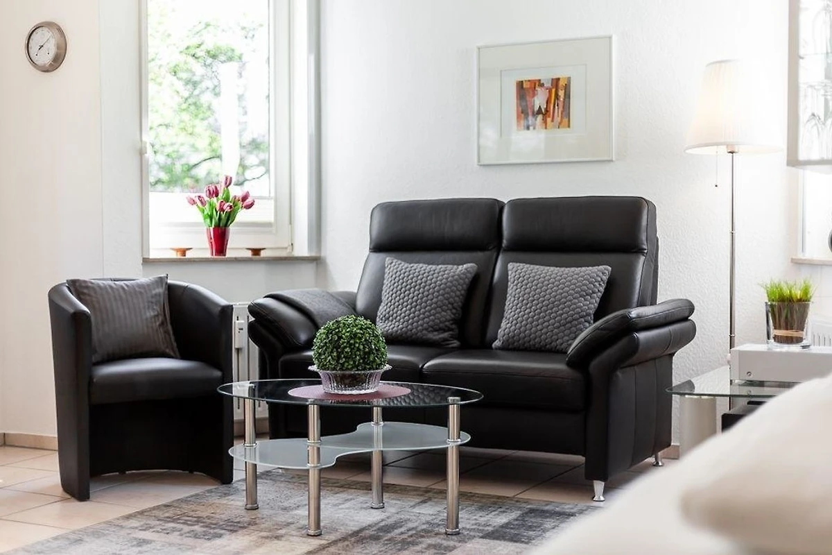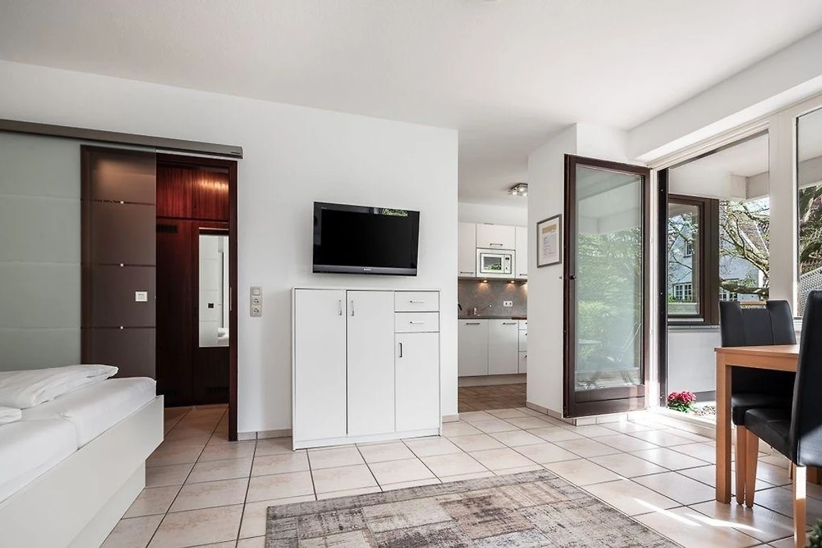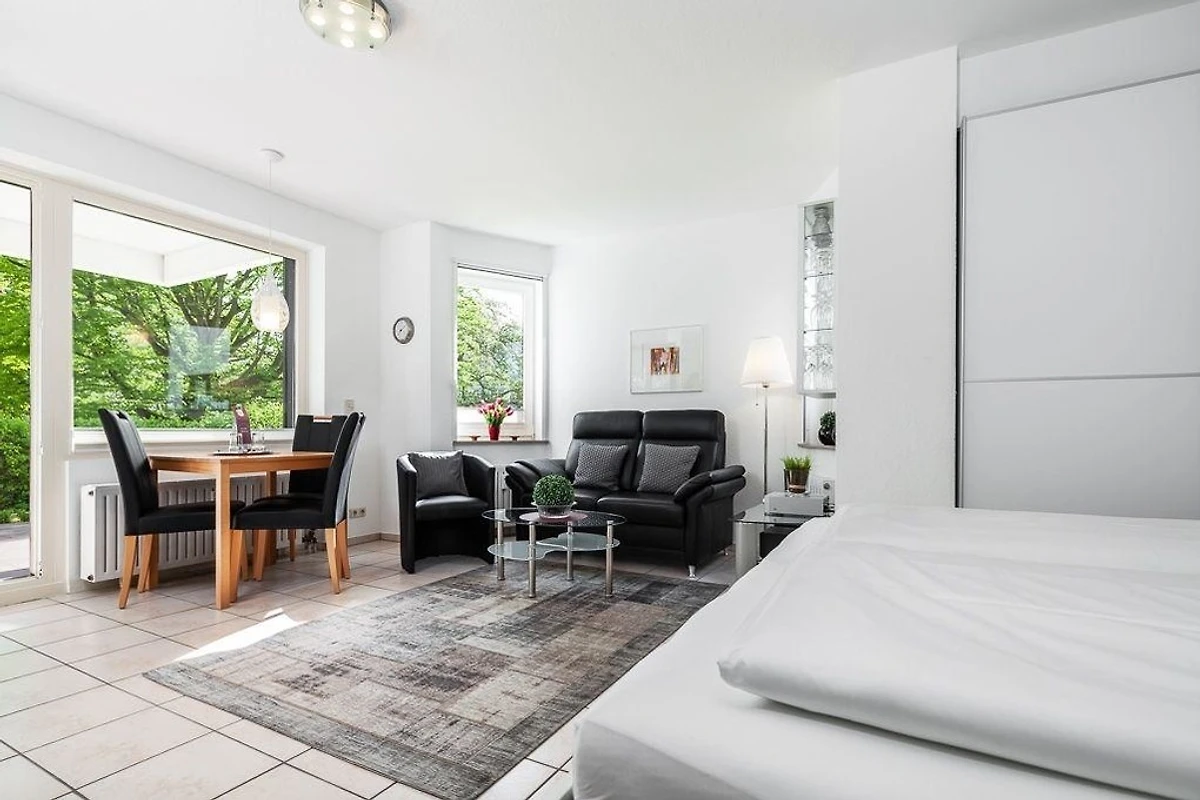 Das 1-Zimmer-Appartement verfügt über einen hellen kombinierten Wohn-Schlafraum. Der Schlafbereich ist ausgestattet mit einem Doppelbett 1,80x2,00 m, Bettkasten und Matratzen der Stärke H3, einem Kleiderschrank mit Schiebetüren, Nachtschränke und Lesebeleuchtung über dem Bett. Im Wohnbereich befindet sich ein Ledersofa, ein Sessel,