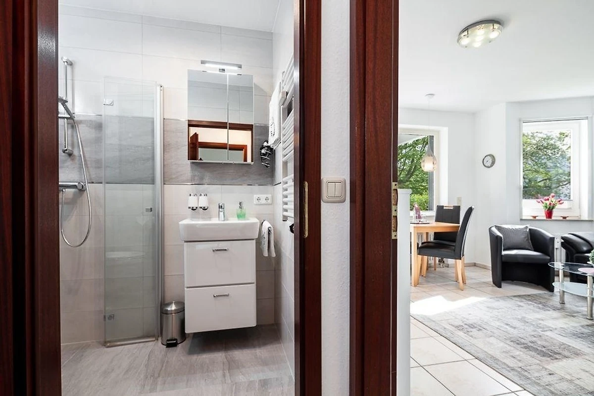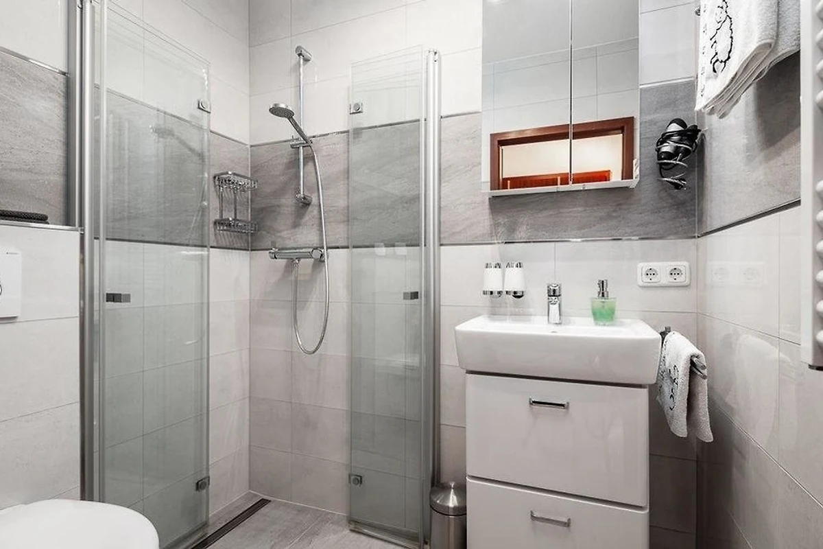 Der Duschbereich wurde barrierefrei eingerichtet, ein Spiegelschrank und ein Waschtischunterschrank bieten genug Platz zur Aufbewahrung.
