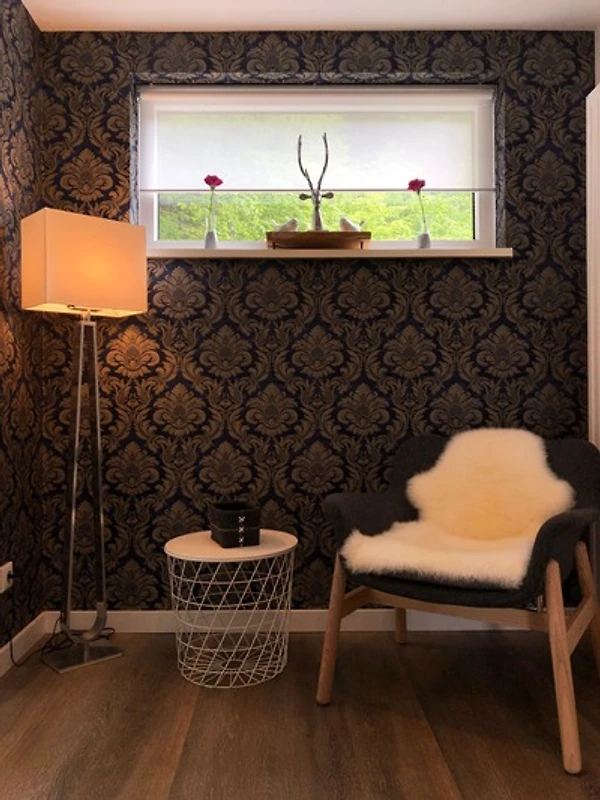 Die Ausstattung: Ein grosses Wohnzimmer (ca.22m²), mit grossen Panoramafenstern, bietet einen schönen Ausblick auf die umgebende Natur mit seinen Bewohnern.