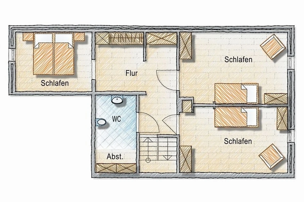Diese flexible und komfortable Zimmeraufteilung ermöglicht die Nutzung für die unterschiedlichsten Gästekonstellationen.