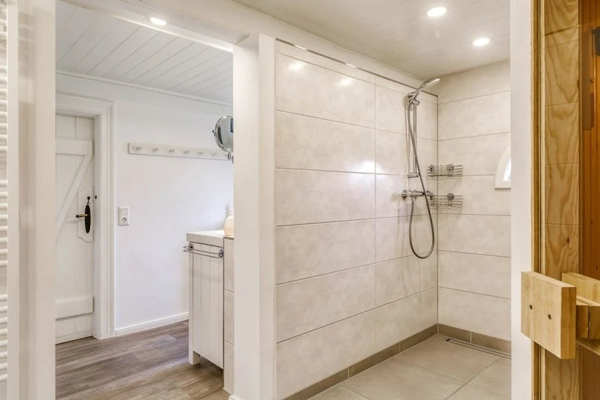Das Bad im Erdgeschoss ist das Hauptbad mit grossem Duschbereich und Sauna.
