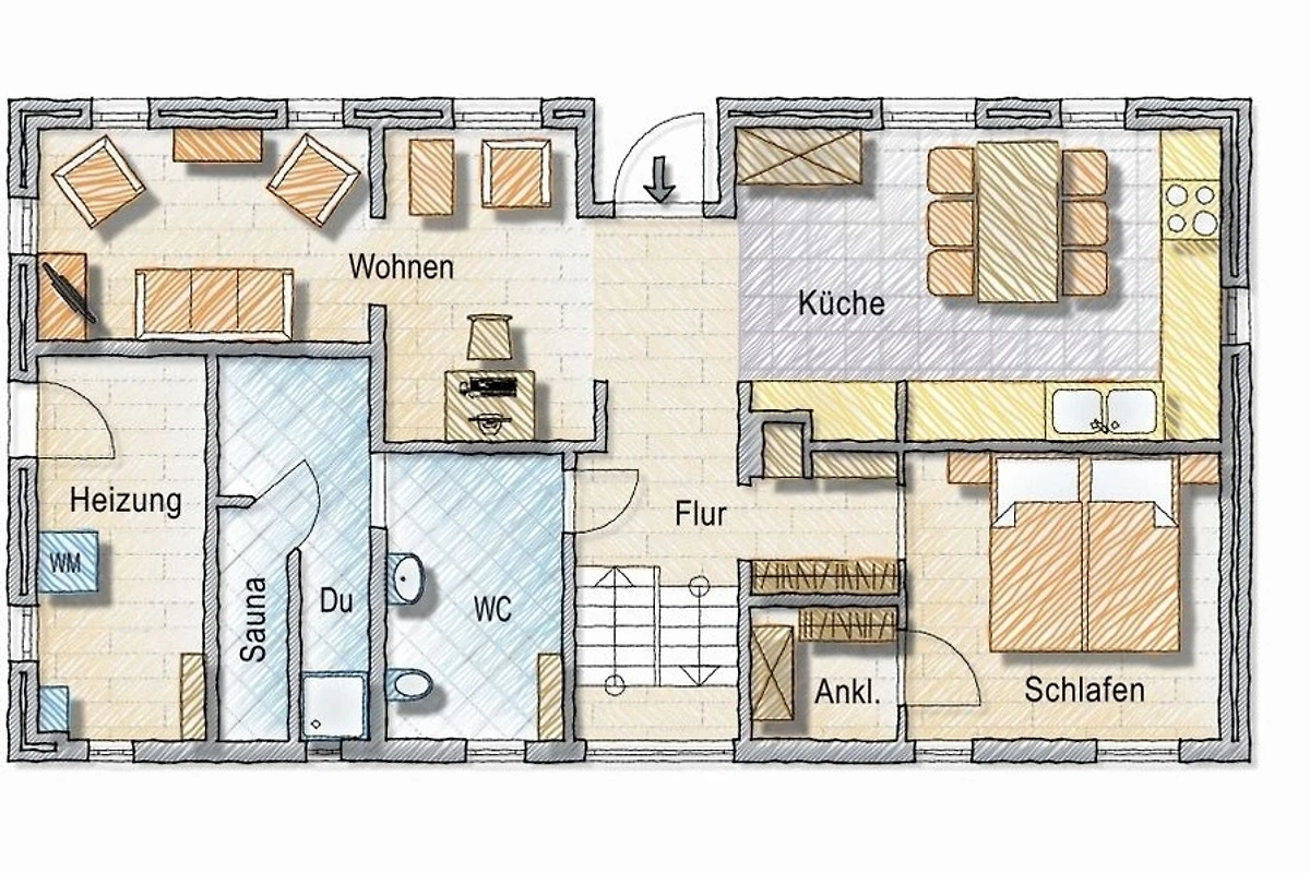 Die Küche ist modern gestaltet und doch gleichzeitig gemütlich und geschmackvoll eingerichtet. Sämtliche technische Geräte und Hilfsmittel sind zu vorhanden, wie Spülmaschine, Elektroherd, Kühlschrank mit Gefrierfach, Mikrowelle und vieles mehr.