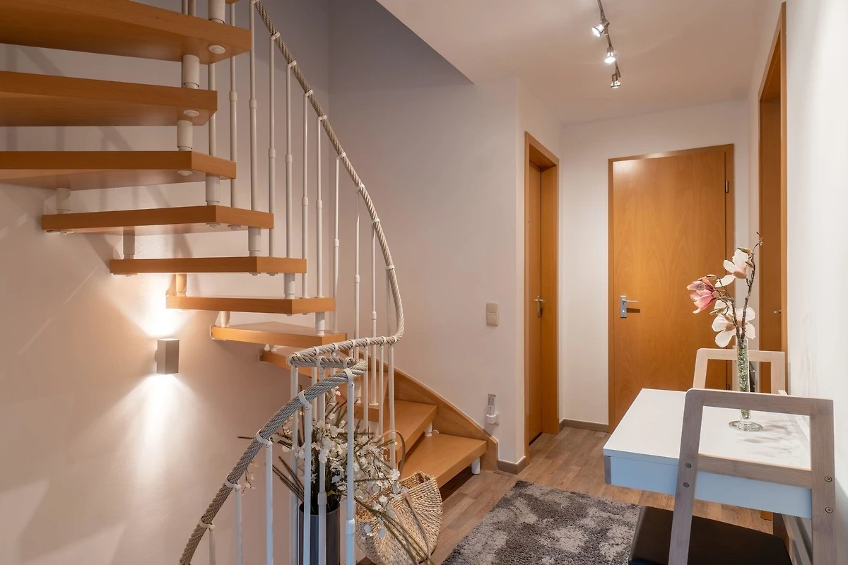 Im Erdgeschoss ist der Eingangsbereich mit Garderobe, Abstell-/ Schuhkammer und der Treppe zum Hauptetage (unter der Treppe befinden sich zwei Liegestühle für den Gartenbereich).