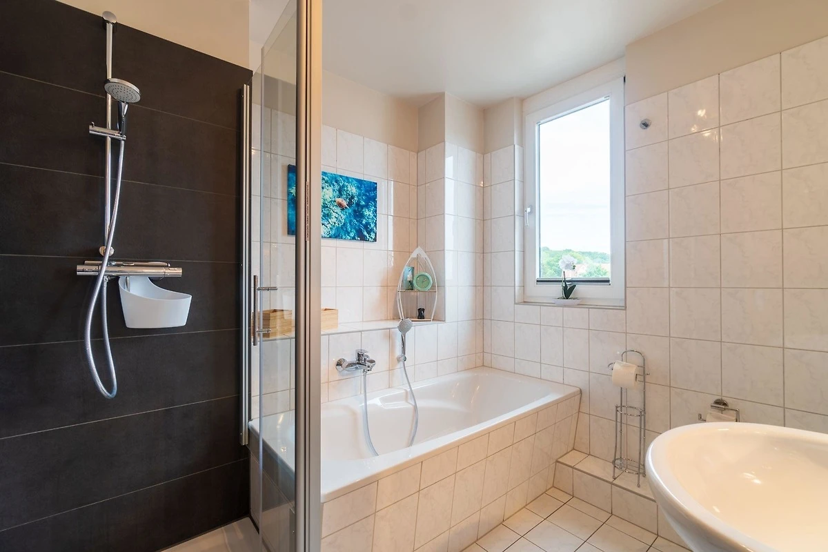 Im zweiten OG gibt es drei Schlafzimmer (jeweils mit Doppelbetten) sowie das grosse Badezimmer mit Dusche & Badewanne. Die hochwertige Ausstattung wird durch zwei moderne TV-Geräte sowie WLan ergänzt.