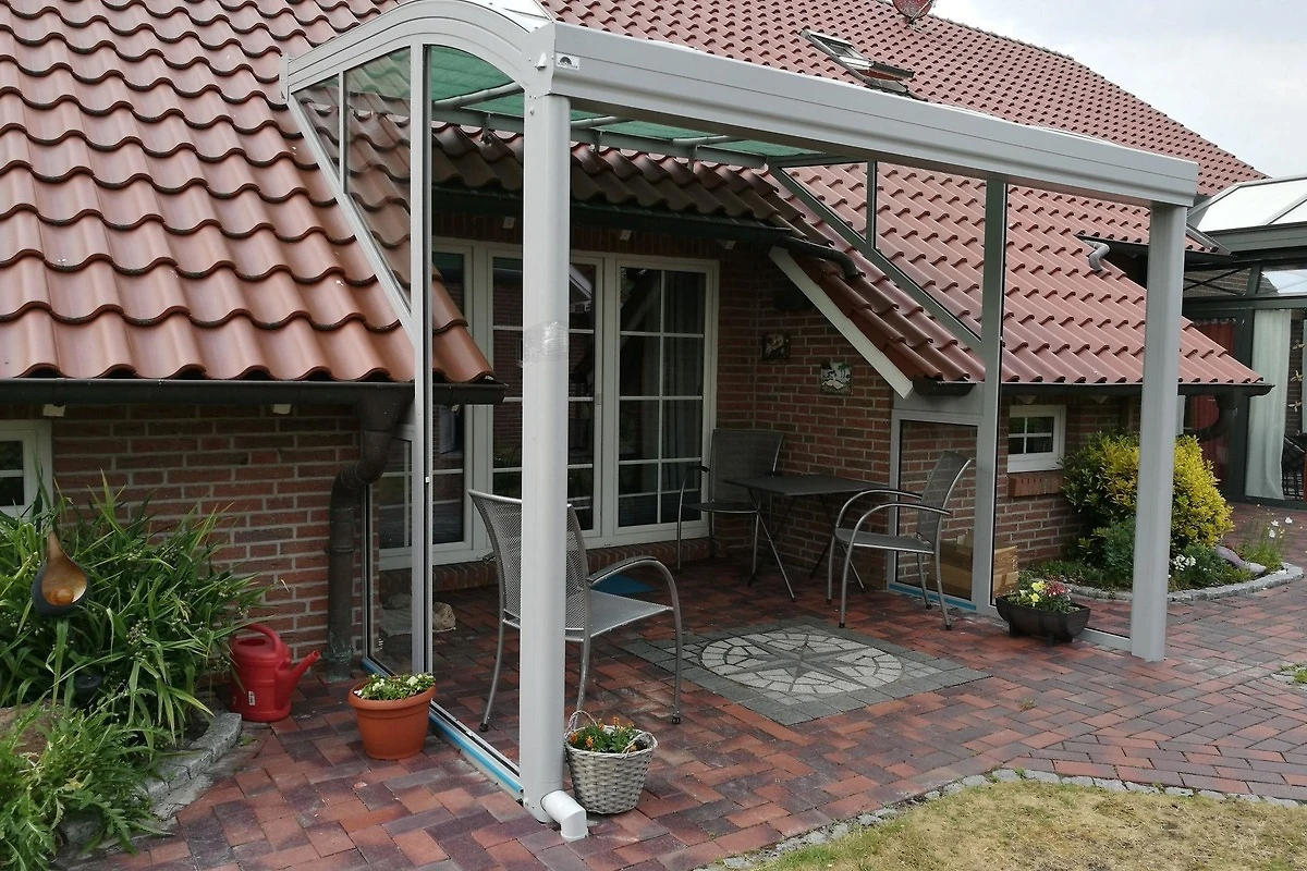 Die Terrasse hat eine Glasüberdachung mit Sonnenschutz und wird von den Gästen gerne genutzt.