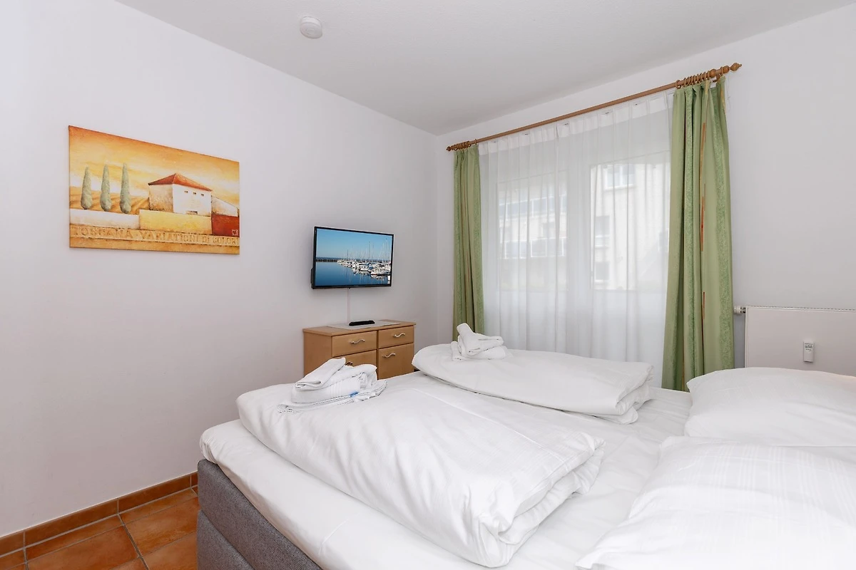 Die 61 m² grosse Wohnung für 3 Personen befindet sich im Erdgeschoss und verfügt über einen problemfreien ebenerdigen Zugang mit Süd-Ost-Terrasse, die einen schönen Blick über den Yachthafen und das Meer ermöglicht.