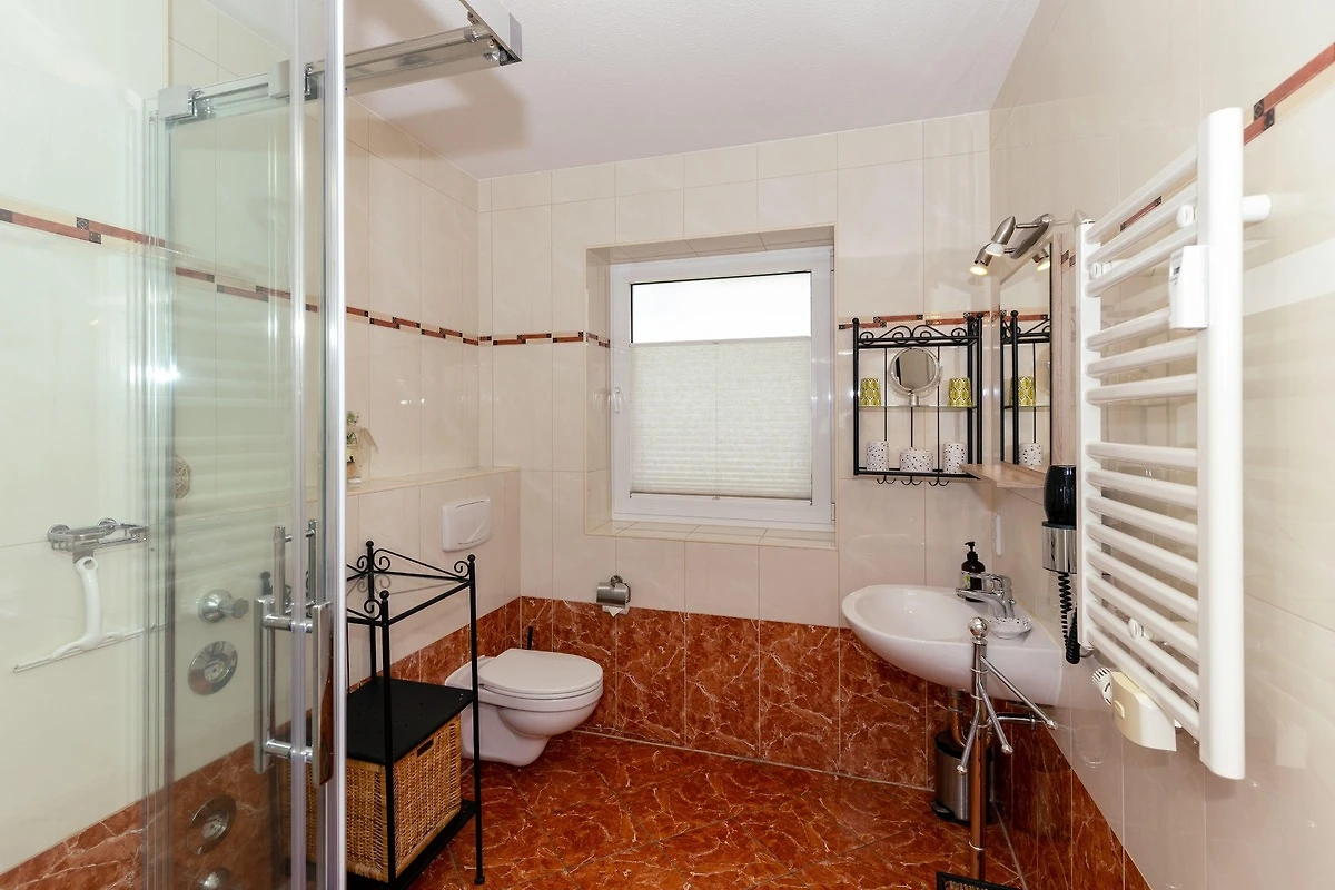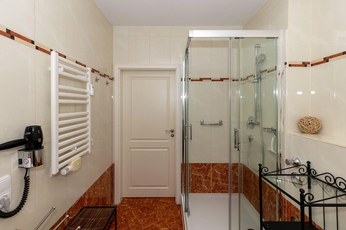 Das voll geflieste Bad im mediterranen Stil verfügt über eine komfortable Dusche und sorgt mit Handtuchwärmer und Fussbodenheizung auch bei kühleren Tagen für einen angenehmen Start in den Tag.