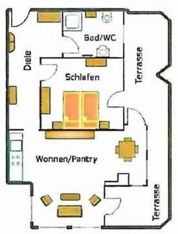 Der Wohn-/Essbereich verfügt über zwei direkte Zugänge zur umlaufenden Terrasse und ist mit hochwertigen Möbeln bestückt. Eine viersitzige Essgarnitur, ein grosses Sideboard mit 40 Zoll Flachbild-Fernseher und eine Multifunktions-Couchgarnitur garantieren erholsame Stunden mit der Familie. Eine alle Bequemlichkeiten bietende, voll ausgestattete Küche rundet den Komfort des Apartments ab.