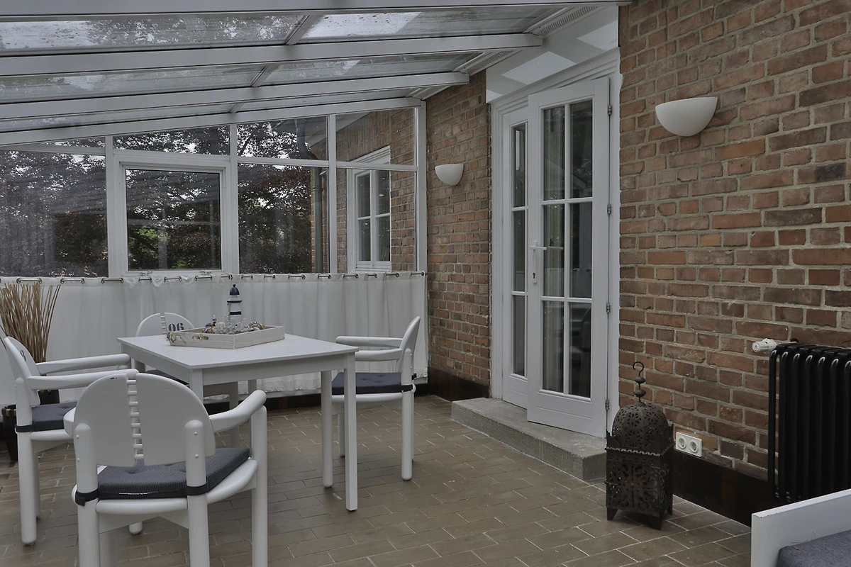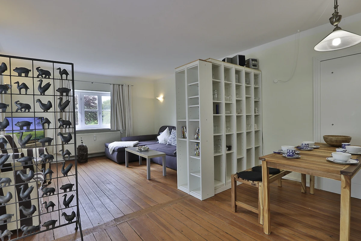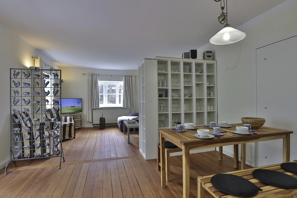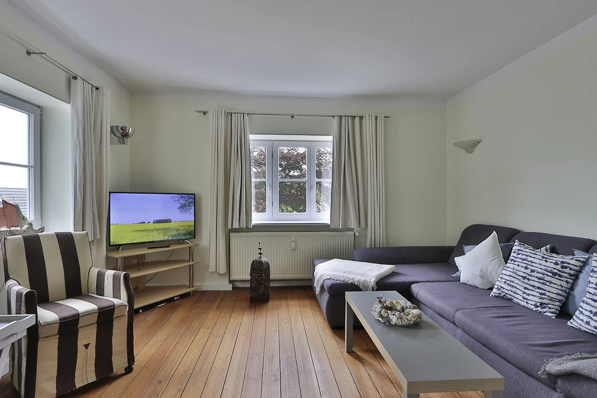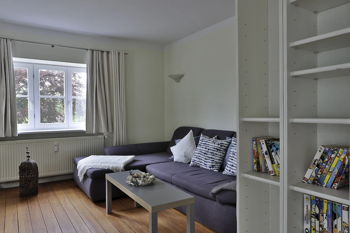 Die sehr helle Maisonette-Ferienwohnung, in einer weissen Villa direkt am Buchenberg gelegen, ist gemütlich und rustikal eingerichtet . Eine Wohnküche bietet alle modernen Küchengeräte, wie z. B. Geschirrspüler, Herd mit Backofen, Mikrowelle, Kühlschrank mit Gefrierteil, Kaffeemaschine, Toaster und Wasserkocher sowie einen gemütlichen Esstisch. Weiterhin sind ein Fernseher, Radio sowie CD- und DVD-Spieler und eine Schlafcouch vorhanden. Der Wohnbereich wird durch einen wunderschön geräumigen Wintergarten erweitert. Im ersten Schlafzimmer steht ein Doppelbett und im 2. befinden sich 3 Einzelbetten . Die Schlafräume sind über eine Treppe im Wohnzimmer zu erreichen. Das Bad hat eine Dusche und im Waschhaus steht eine Waschmaschine zur Verfügung. Für behagliche Wärme sorgt eine Zentralheizung. Die ganze Wohnung ist im maritimen Flair eingerichtet. Auf dem weitläufigen Grundstück befindet sich ein Grillplatz mit Gartenmöbeln. Das Auto steht direkt neben dem Haus auf dem Grundstück. Der Wohnungszugang erfolgt über eine gewendelte Aussentreppe.