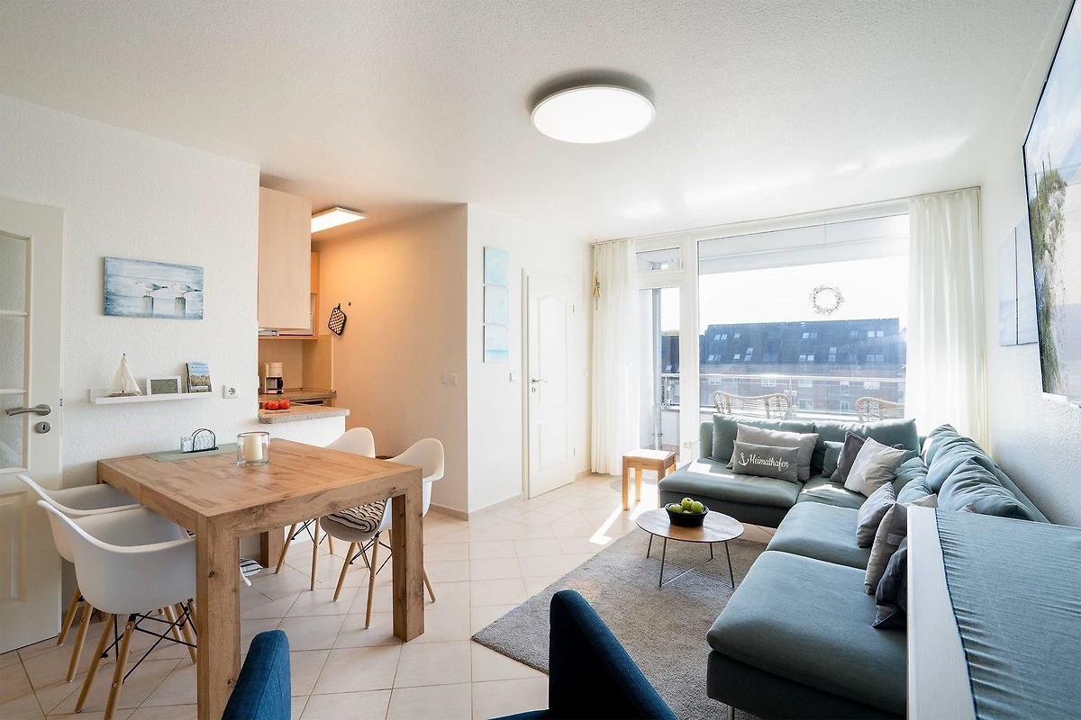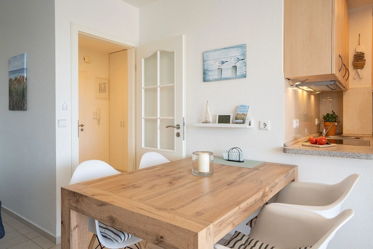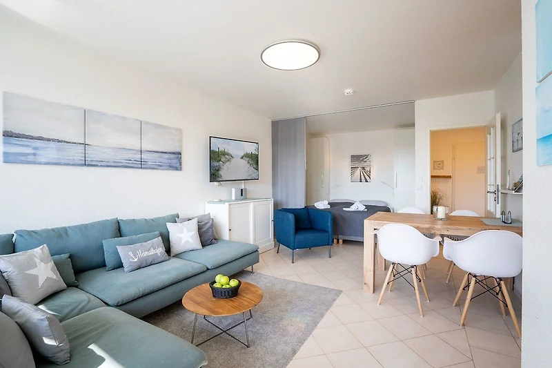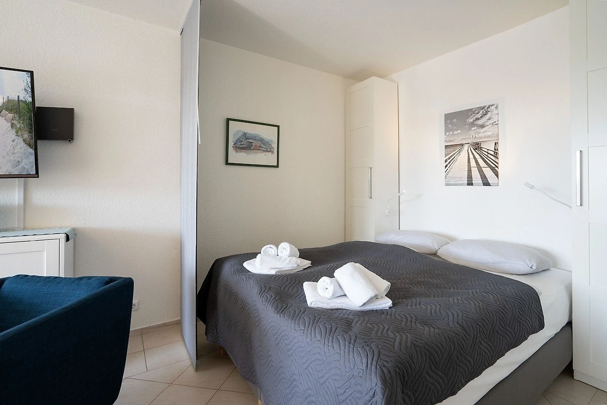 Das 2-Zimmer-Komfort-Appartement im 3. OG (mit Lift) bietet auf ca. 45 m² grosszügigen Wohnraum. Es ist geschmackvoll renoviert und verfügt über einen hellen Wohnbereich mit Fliesenboden, einem einladenden Sofa sowie zwei Smart TVs und W-LAN. Die moderne Einbauküche ist vollständig ausgestattet, inklusive Geschirrspüler und Mikrowelle. Ein Boxspringbett (2x80x200 cm) im Wohnbereich sowie ein separates Schlafzimmer mit Doppelbett und Kleiderschrank bieten komfortable Schlafmöglichkeiten. Das Duschbad/WC ist mit einer ebenerdigen Duschkabine und einer Waschtischablage aus Granit ausgestattet. Garderobenschränke sorgen für ausreichend Stauraum. Waschmaschine und Trockner sind im Haus gegen Gebühr nutzbar. PKW-Stellplatz ist inklusive. In der Zeit vom 01.05. bis 10.09. steht ein kostenloser Strandkorb zur Verfügung. Die Nutzung des Aussenschwimmbades ist saisonal vom 01.06. bis 15.09. möglich.