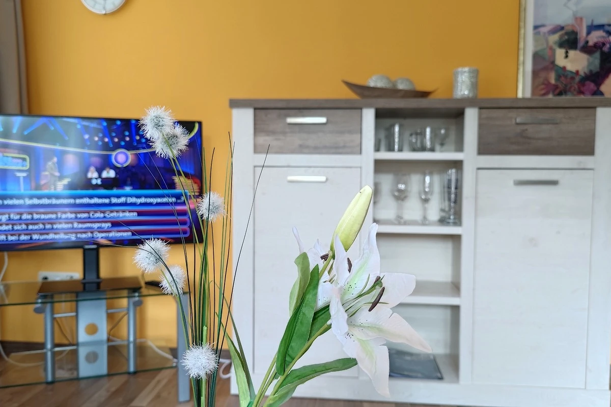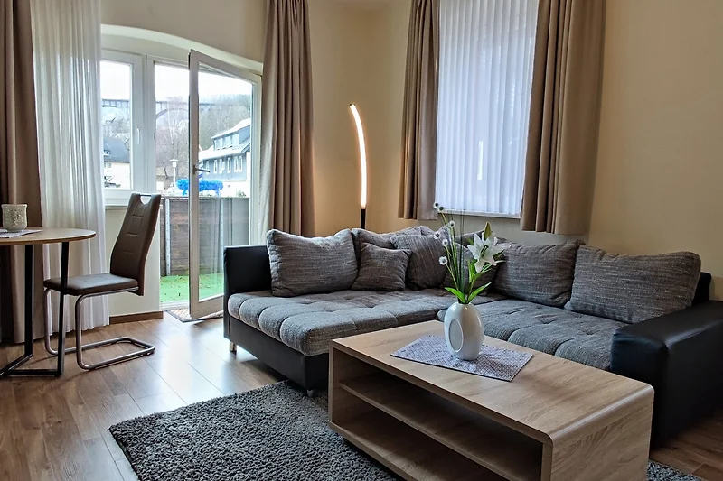 Das Apartment befindet sich im 1. Stock und bietet Ihnen auf ca. 42 m² ein Schlafzimmer mit Doppelbett, ein Wohnzimmer mit Balkon, eine gemütliche Sitzecke, die ebenfalls für eine dritte Person als Schlafmöglichkeit genutzt werden kann, sowie Sat-TV. Das Bad ist mit Dusche/WC ausgestattet sowie Haarfön, Kosmetikspiegel und Kosmetikartikel.